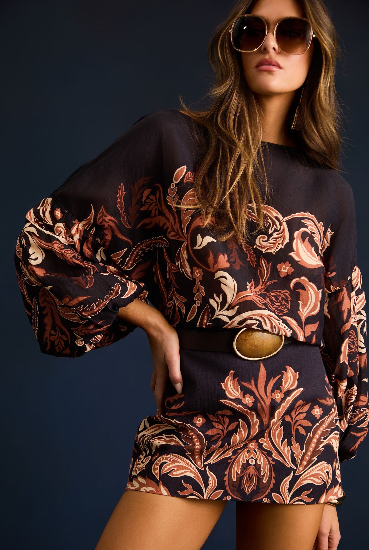 The Lira Mini Skirt from our Fall ’25 Collection is cut in a rich linen-cotton blend and finished with a soft cotton lining for everyday comfort. Featuring a delicate filigree print in deep brown, this relaxed-fit silhouette sits neatly at the waist and finishes with a clean side-zipper closure. Pair it with the matching Lira Top for a coordinated look that’s easy yet elevated.
