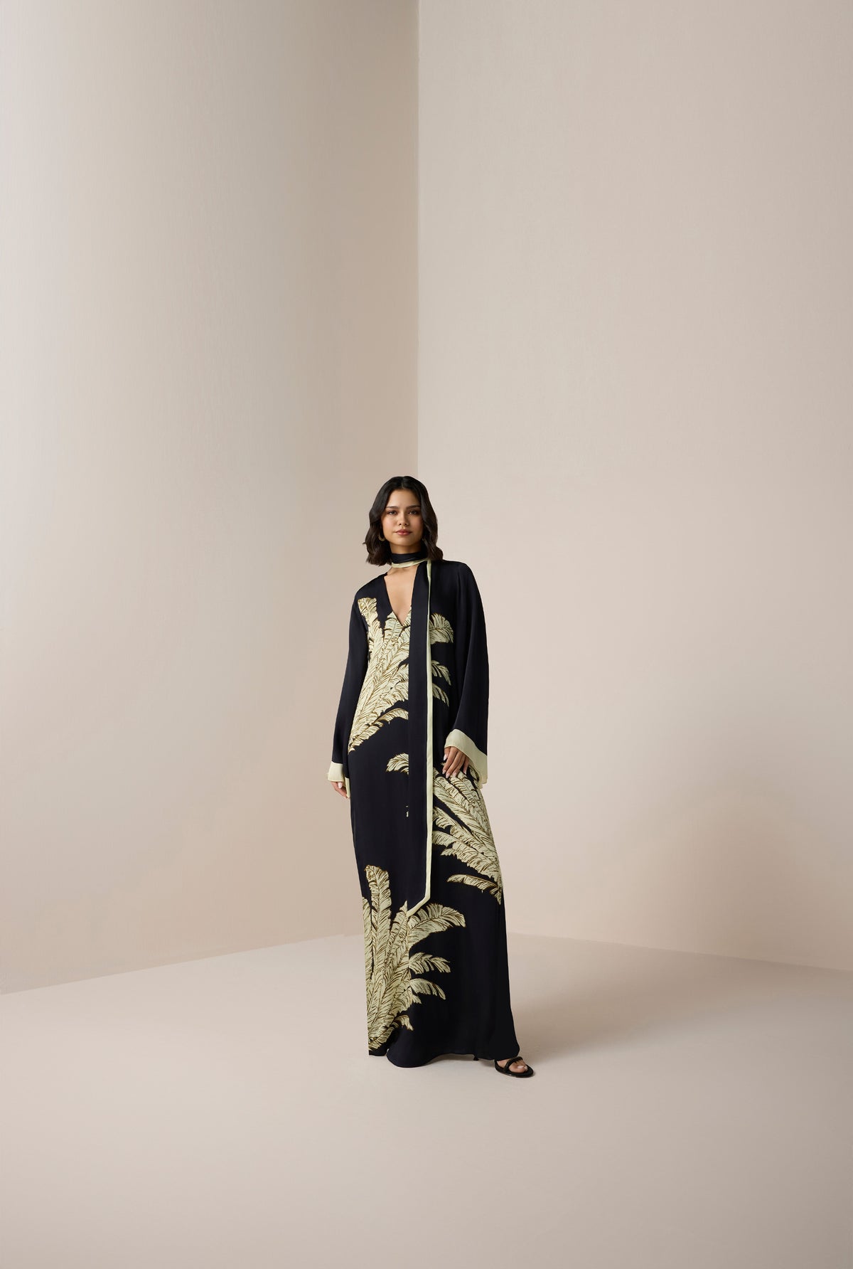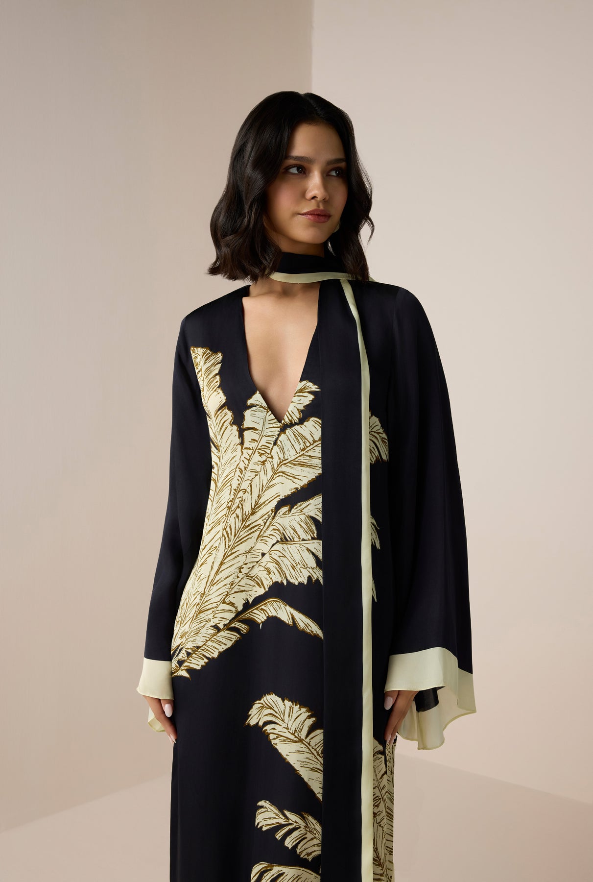 The Palm Belted Kaftan from the Ramadan ’26 collection is designed with grace and effortless charm. Crafted in fluid black viscose satin, it features a flowing silhouette with a V-neckline, slip-on ease, and full flared sleeves that lend a sense of poise. The signature palm print adds subtle artistry, while the tie-up belt allows for versatile styling. A timeless piece that balances modest elegance with contemporary appeal, it's perfect for Ramadan gatherings.
