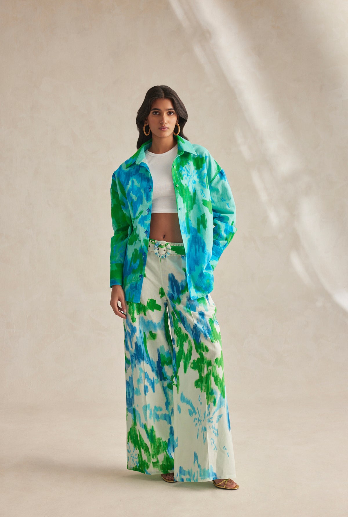 The mesmerizing ikat print, in vibrant shades of blue and green, adorns the shirt, adding a touch of artistic flair. With its oversized silhouette, classic shirt collar, front placket closure, and straight hemline, this shirt effortlessly blends casual chic with bohemian vibes. Pair it with the Vida Pants for that vibrant splash of Spring look.