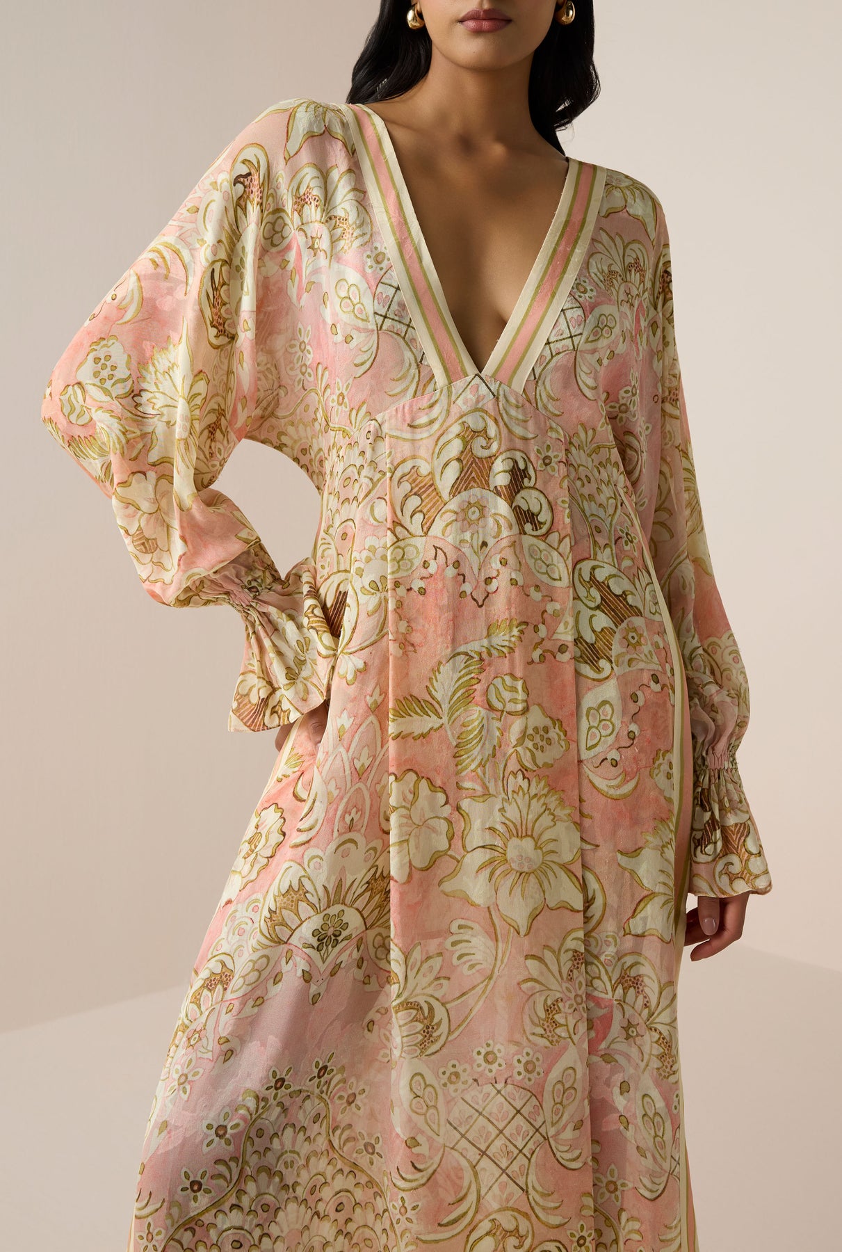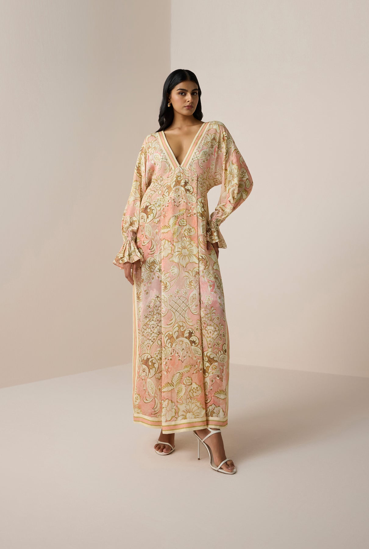 The Anah Maxi Kaftan from the Ramadan ’26 collection brings a refined touch to festive dressing. Crafted in peach viscose flower jacquard, it features a relaxed silhouette with a V-neckline and flowing back ties. Blouson sleeves with ruffles add a touch of flair, while a side slit lends ease of movement. Paired with a floral filigree-printed slip, it balances timeless charm with contemporary elegance.