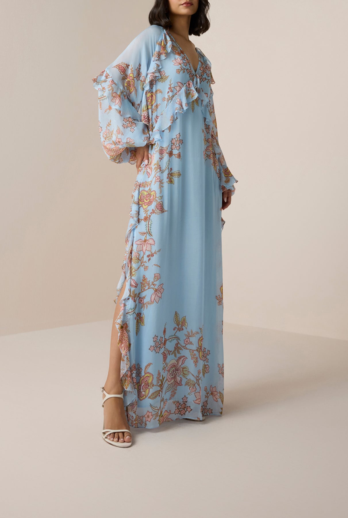 The Riah Kaftan from the Ramadan'26 collection is a refined blend of comfort and style in powder blue viscose flat chiffon. Featuring a floral chintz print, this slip-on kaftan showcases a V-neckline, blouson sleeves, and a delicate ruffle detailing along the sleeves, bodice, and sides.  A loose, flowing fit that drapes beautifully, it comes with a matching blue slip for effortless layering, making it an elegant choice for festive occasions.
