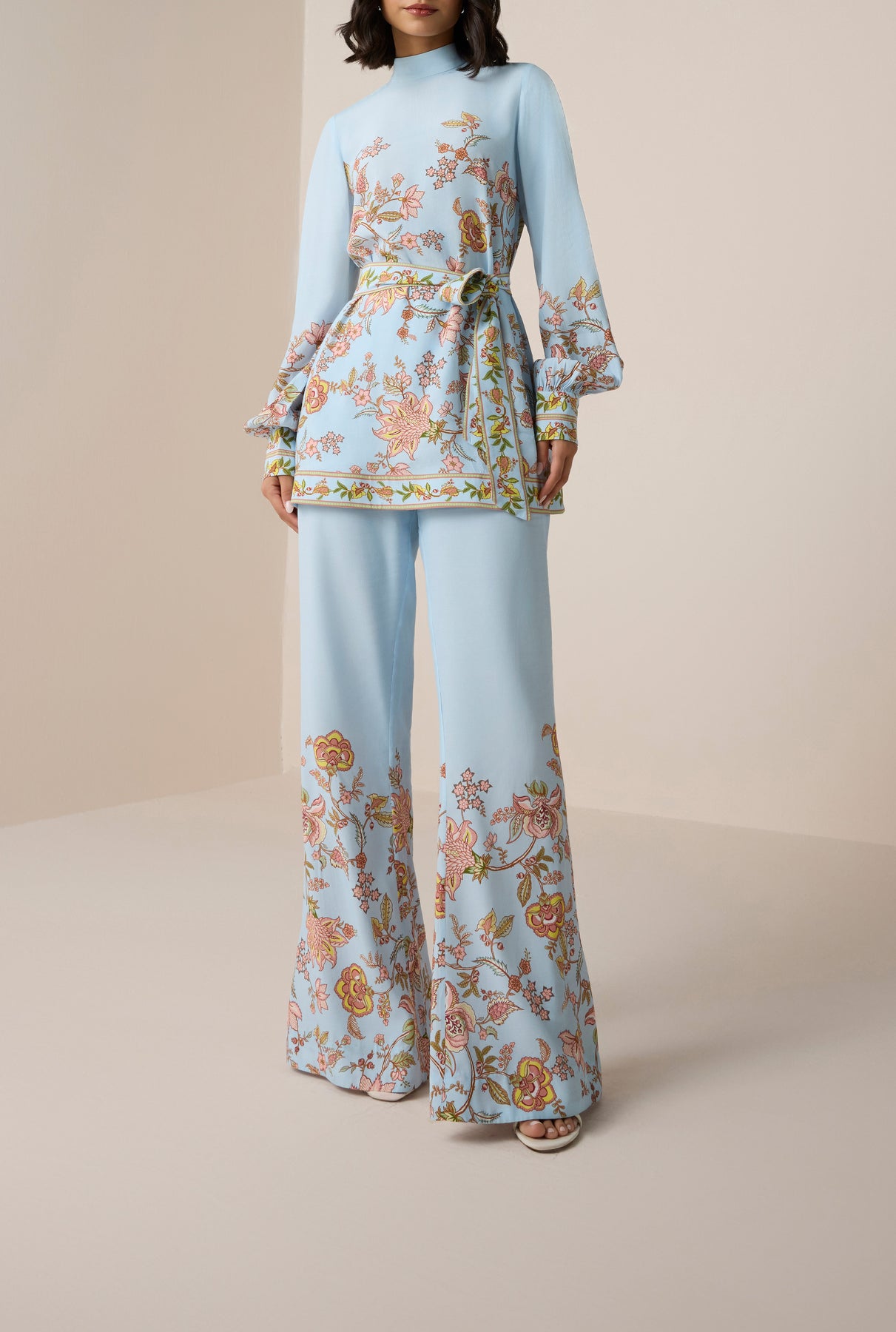 The Riah Scarf Neck Top from the Ramadan ’26 collection brings refined grace to contemporary occasion dressing. Crafted in powder blue viscose heavy crepe, it features a delicate floral chintz pattern that evokes timeless charm. The mock neck and blouson sleeves, with their cuffs, add structure and poise, while the buckle belt defines the waist for a flattering silhouette. Finished with a back zipper closure and a relaxed fit, it’s a versatile piece that balances elegance and ease-perfect for festive gatherings and joyful evening celebrations.