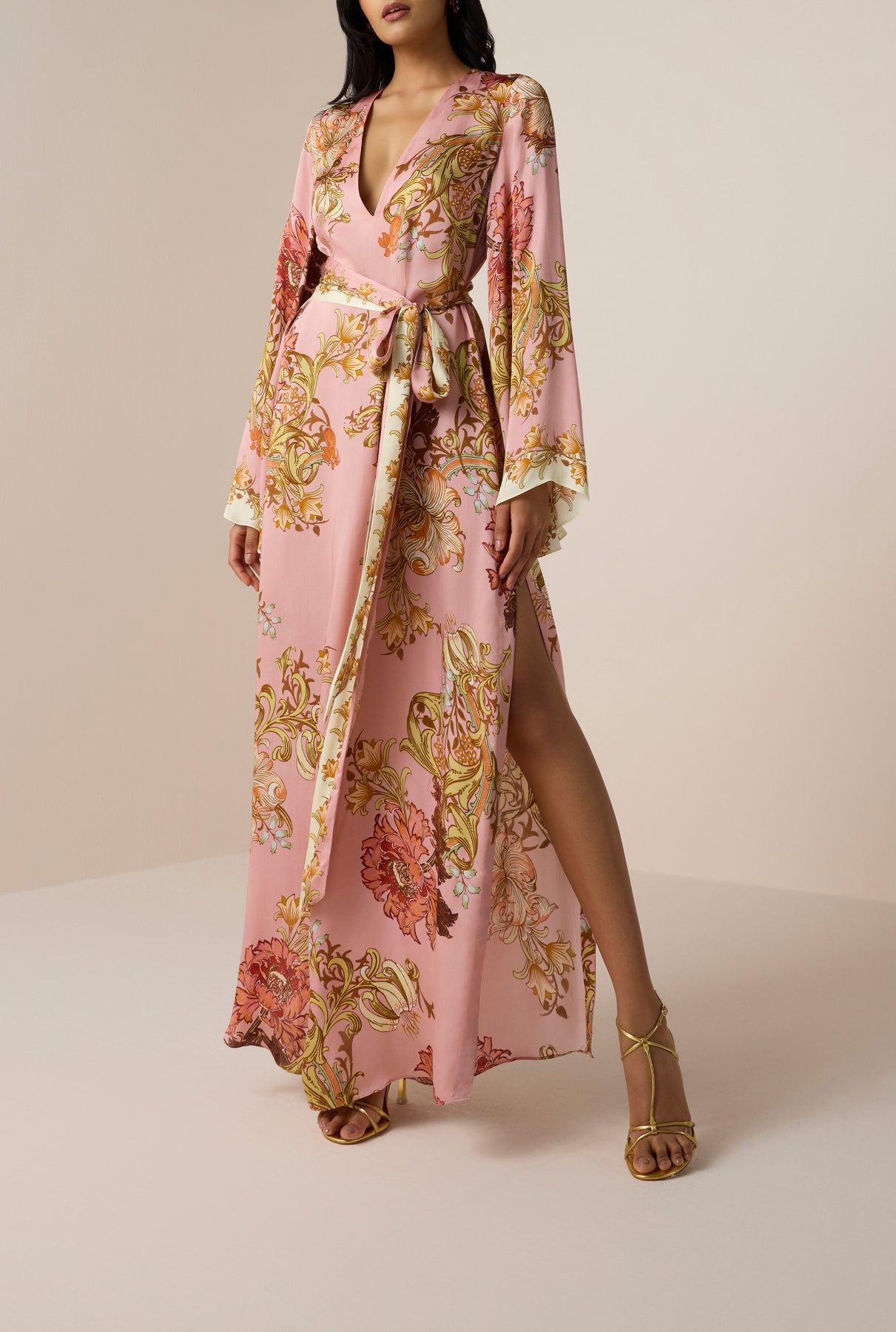 The Sula Belted Kaftan from the Ramadan'26 collection captures a soft yet striking mood in dusty pink viscose satin. Featuring a V-neckline and full flared sleeves, this slip-on silhouette flows beautifully with a relaxed fit and a graceful side leg slit. Fully lined for ease and comfort, it’s finished with a wild floral print and a tie-up belt.
