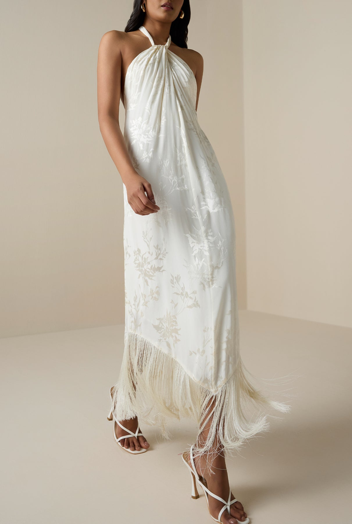 The Aura Halter Neck Maxi Dress from the Resort ’26 collection is a beach-ready, island escape essential. Crafted in ivory viscose flower jacquard, it features a relaxed, fully lined silhouette with a halter neck and sash tie at the back. Boho-inspired fringes at the hem and the sash add a playful aesthetic creating season approved, sun-soaked charm. The side zipper and neck tie ensure a comfortable, seamless fit-perfect for seaside strolls and beachside vacays.