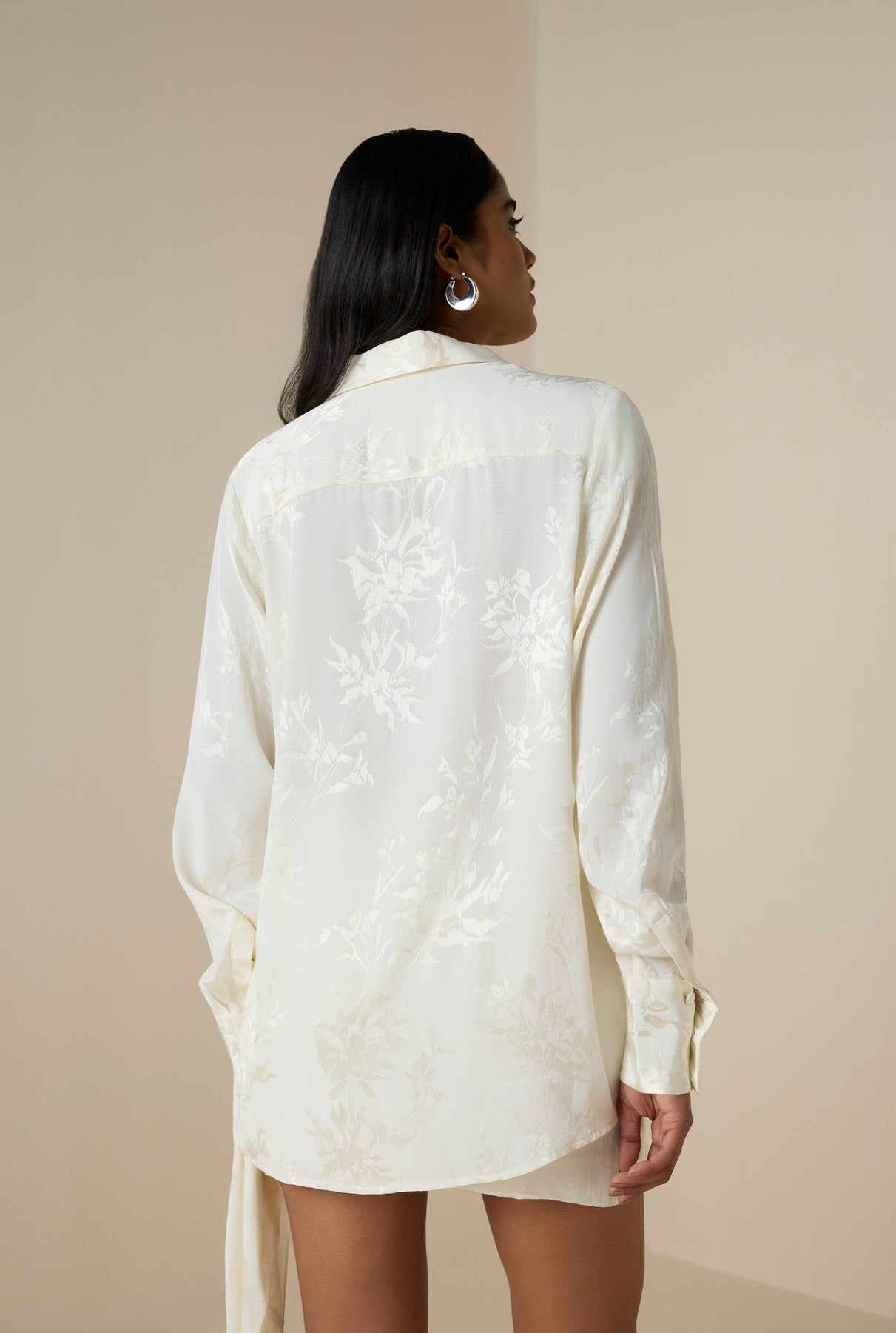 Elevate your Resort ’26 wardrobe with the Aura Shirt. This ivory-hued silhouette is crafted from luxurious viscose flower jacquard and features a subtle self-print for understated texture. Designed in a relaxed, loose fit, it offers a classic shirt collar, front button placket, and cuffed sleeves for effortless style. Perfect for those balmy layered resort looks, pair it with the Aura Fringed Mini Skirt for a complete look.