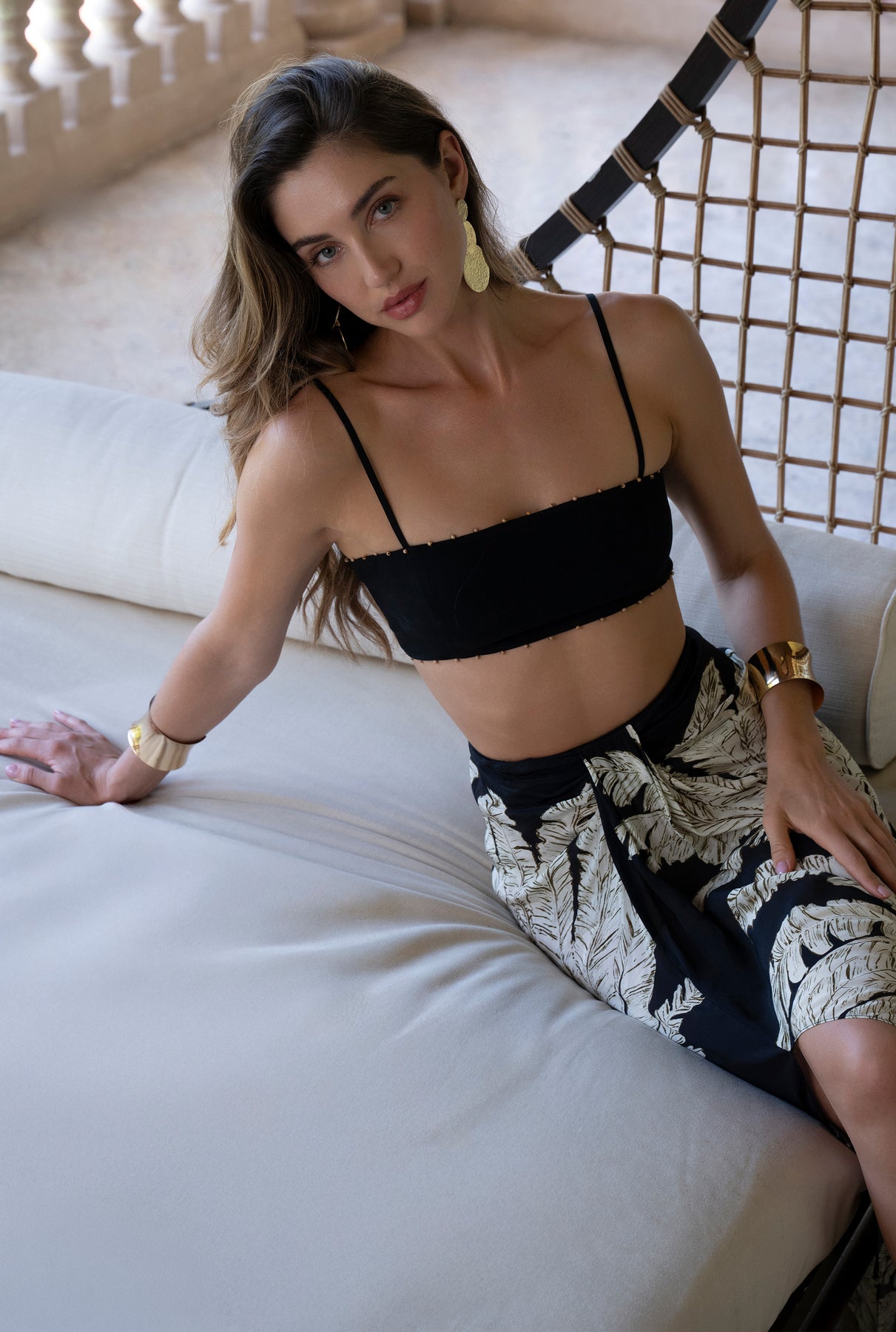 The Bead Highlight Bandeau from the Resort ’26 collection is a sleek, sun-ready piece crafted in black viscose crepe. Featuring a fitted, fully lined silhouette with a side zipper closure, it has a square neckline, delicate spaghetti straps, and smocking at the back for a comfortable, flattering fit. Round beads at the neckline and hem make for a charming detail, making it perfect for layering or pairing with skirts and shorts for that on point resort styling.