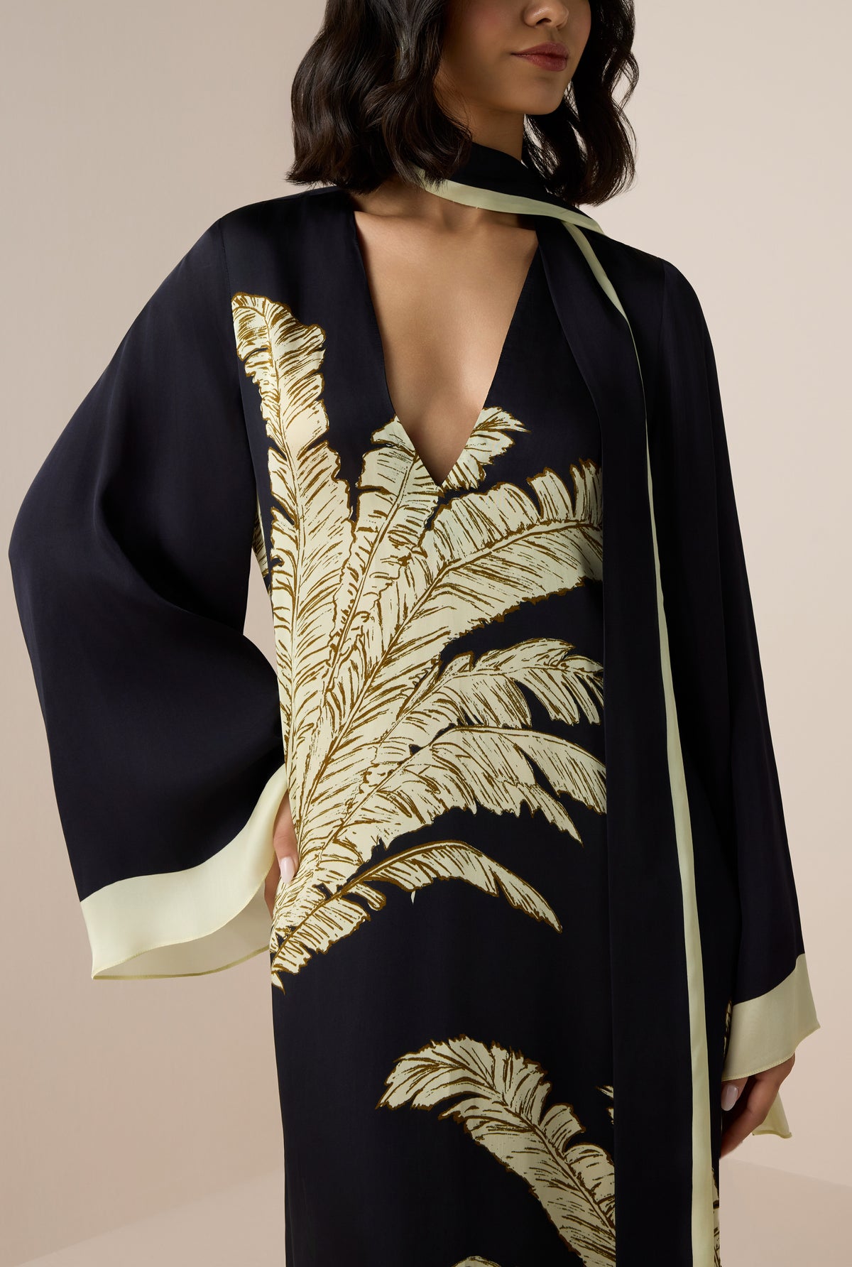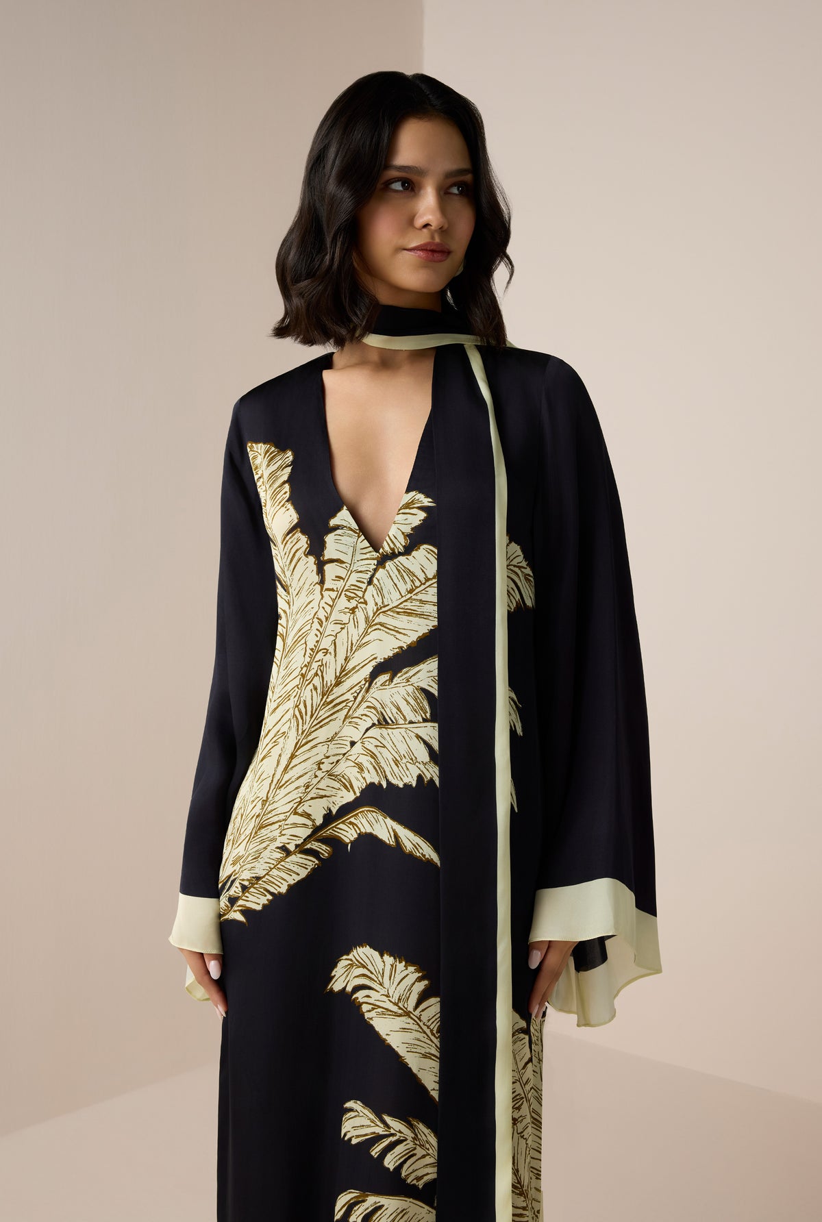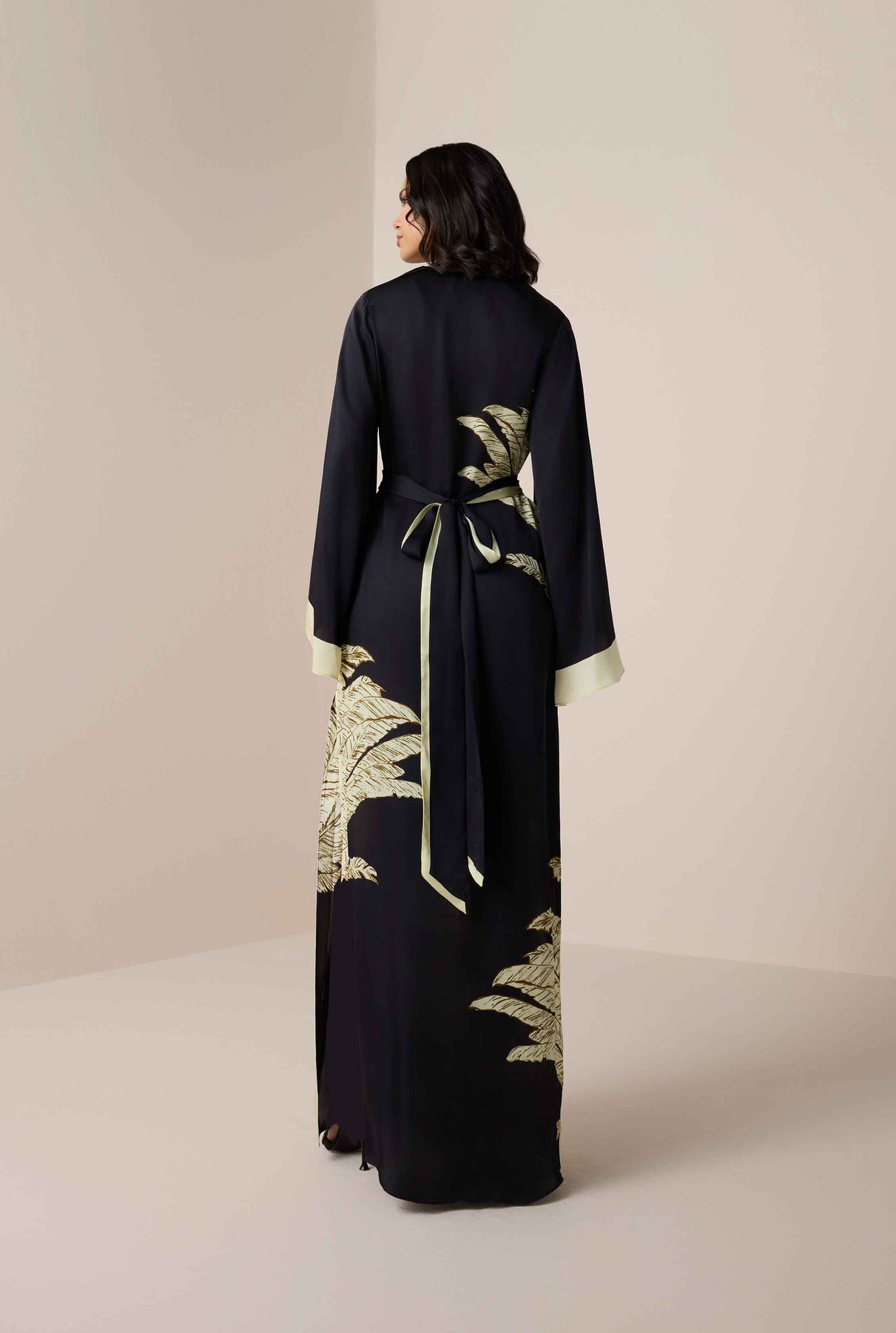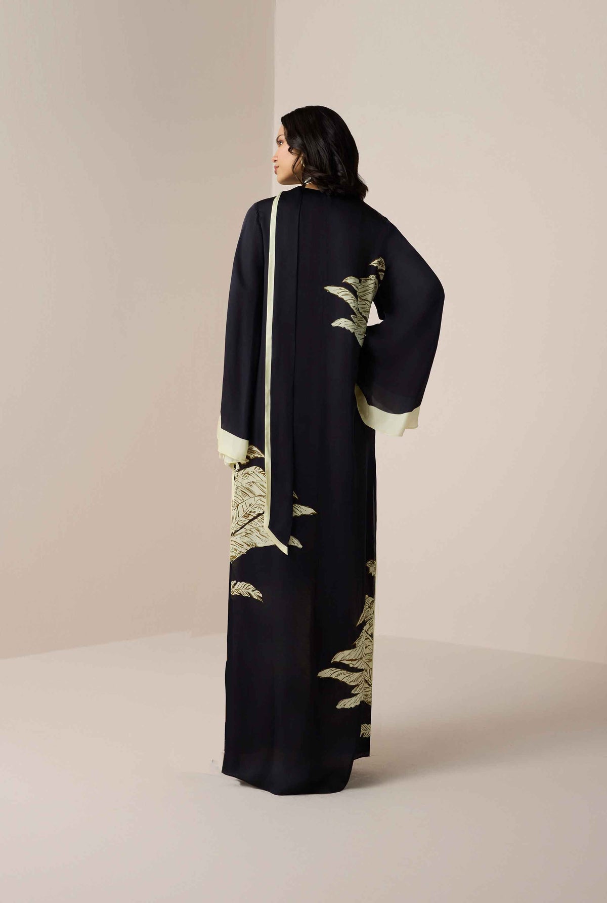 The Palm Belted Kaftan from the Ramadan ’26 collection is designed with grace and effortless charm. Crafted in fluid black viscose satin, it features a flowing silhouette with a V-neckline, slip-on ease, and full flared sleeves that lend a sense of poise. The signature palm print adds subtle artistry, while the tie-up belt allows for versatile styling. A timeless piece that balances modest elegance with contemporary appeal, it's perfect for Ramadan gatherings.