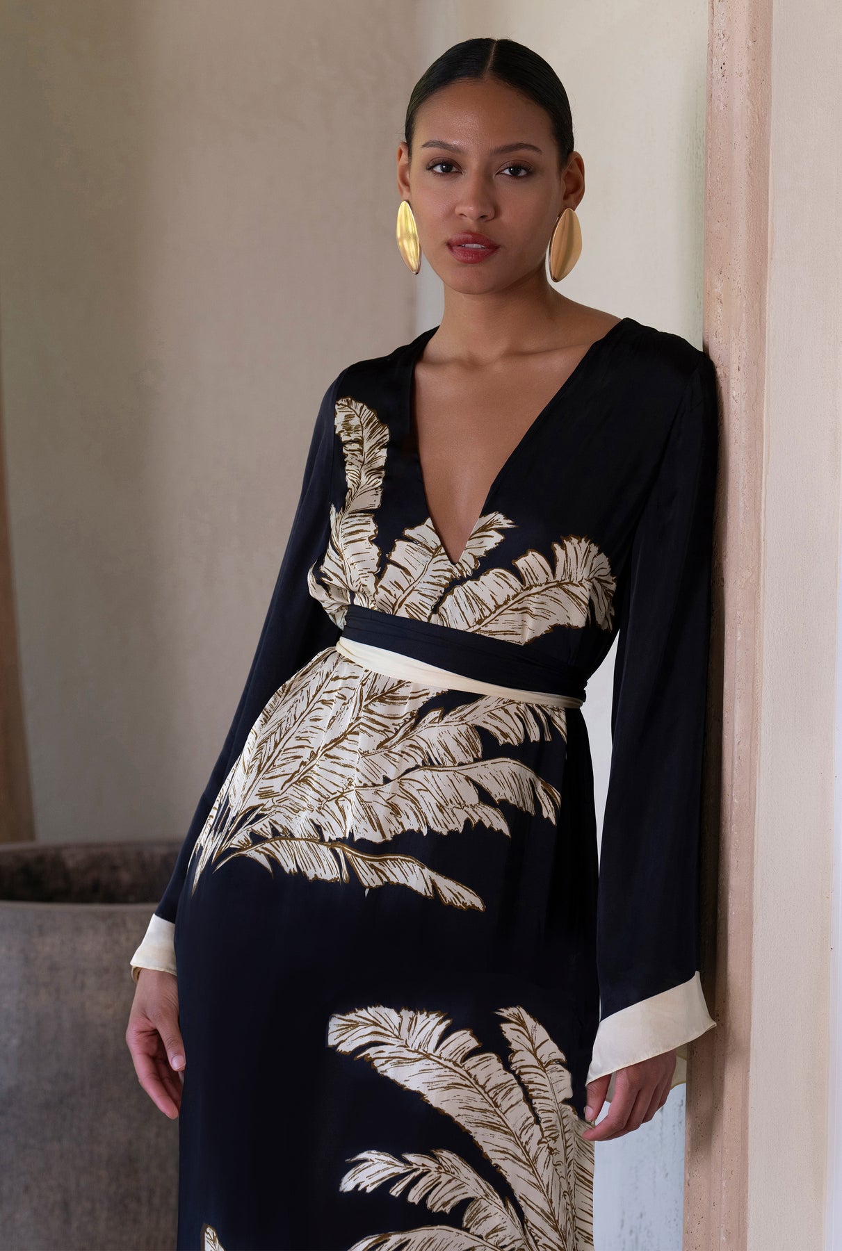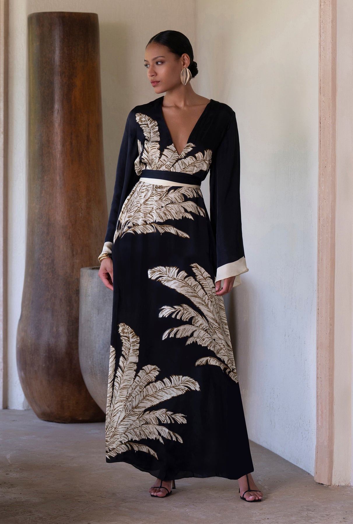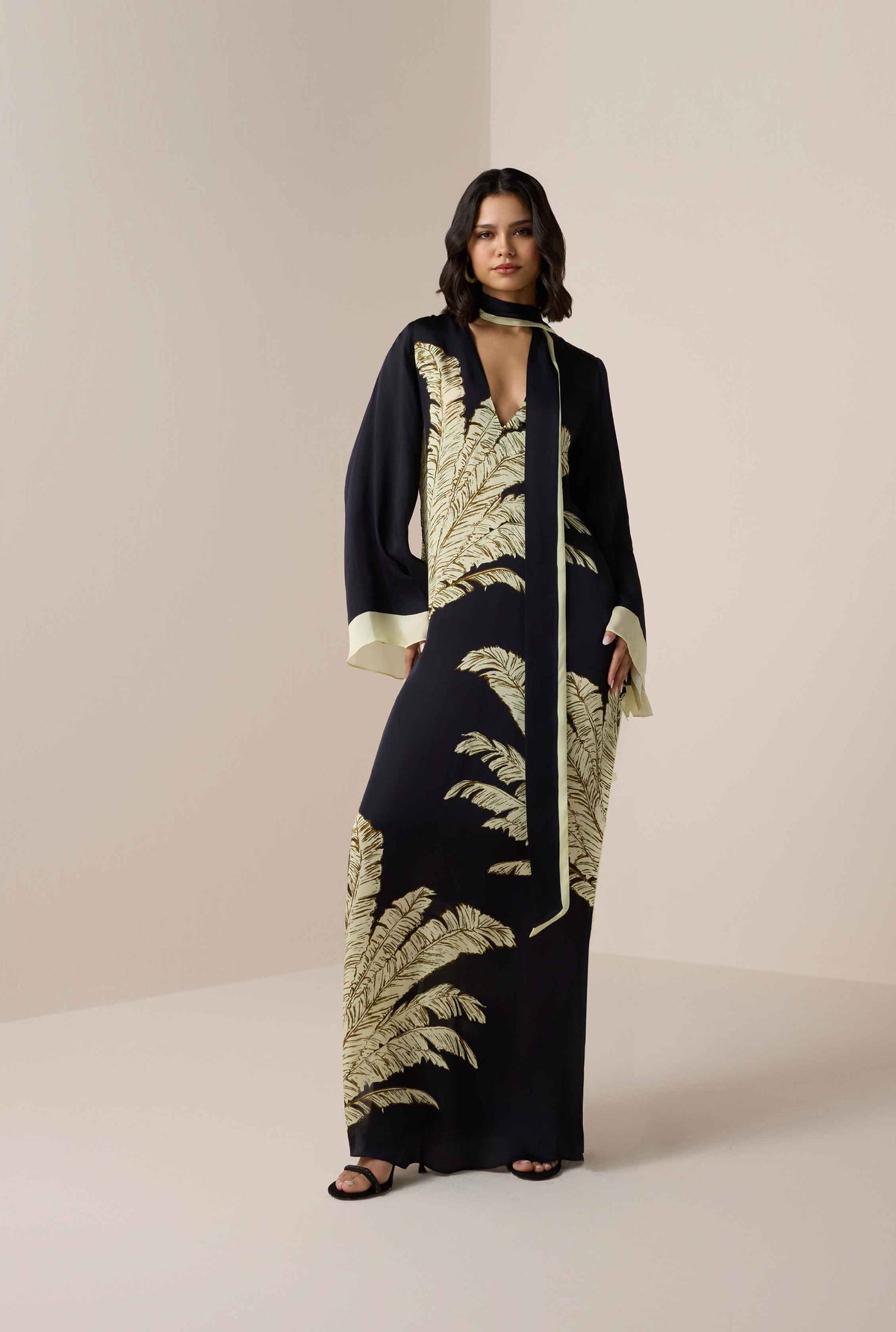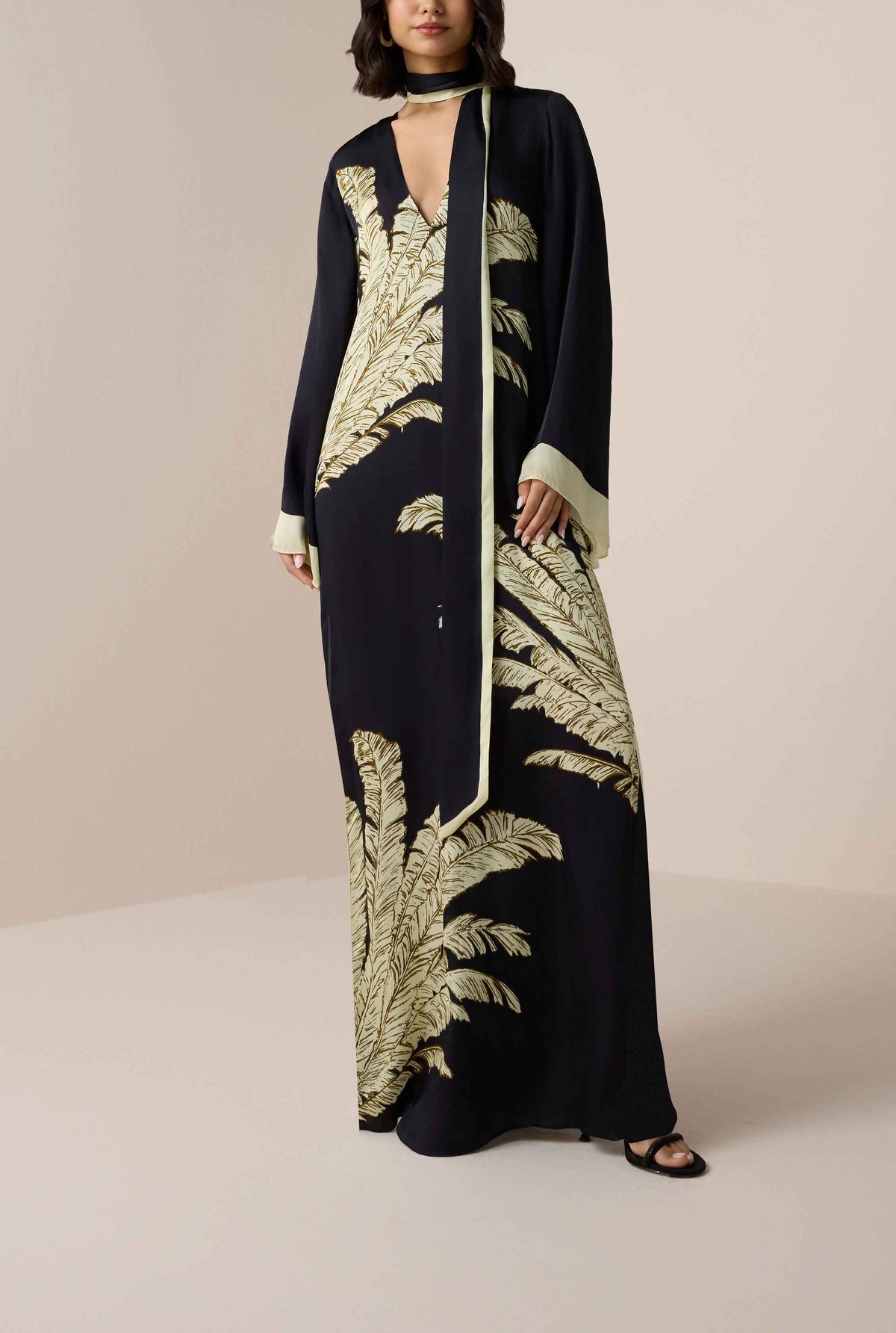 The Palm Belted Kaftan from the Ramadan ’26 collection is designed with grace and effortless charm. Crafted in fluid black viscose satin, it features a flowing silhouette with a V-neckline, slip-on ease, and full flared sleeves that lend a sense of poise. The signature palm print adds subtle artistry, while the tie-up belt allows for versatile styling. A timeless piece that balances modest elegance with contemporary appeal, it's perfect for Ramadan gatherings.