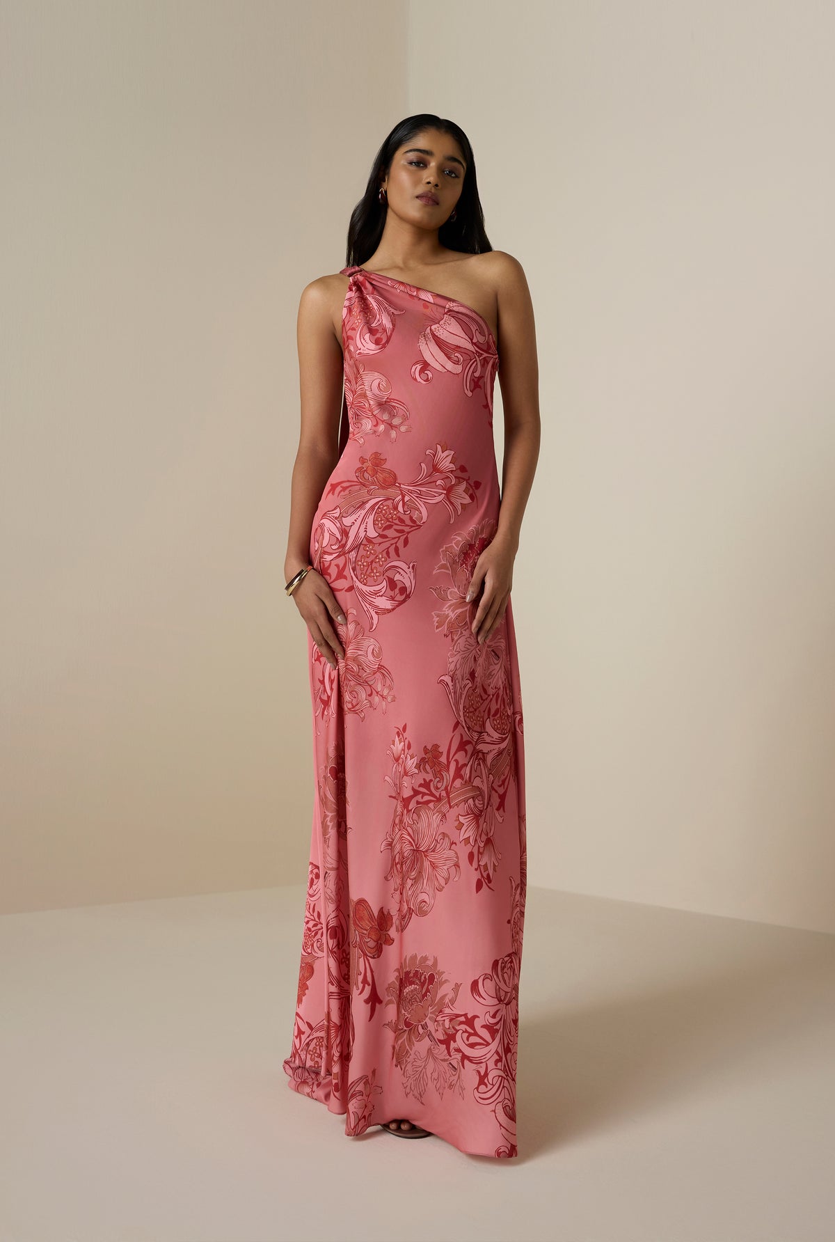 The Vine One-Shoulder Dress from the Resort ’26 collection brings modern femininity to a vibrant, contemporary silhouette. Crafted in coral poly satin lycra and adorned with a pleasing floral print, it features a fitted bodice with a sleek one-shoulder neckline for understated drama. The side zipper ensures a smooth finish, while the fluid sash detail adds soft movement and grace.