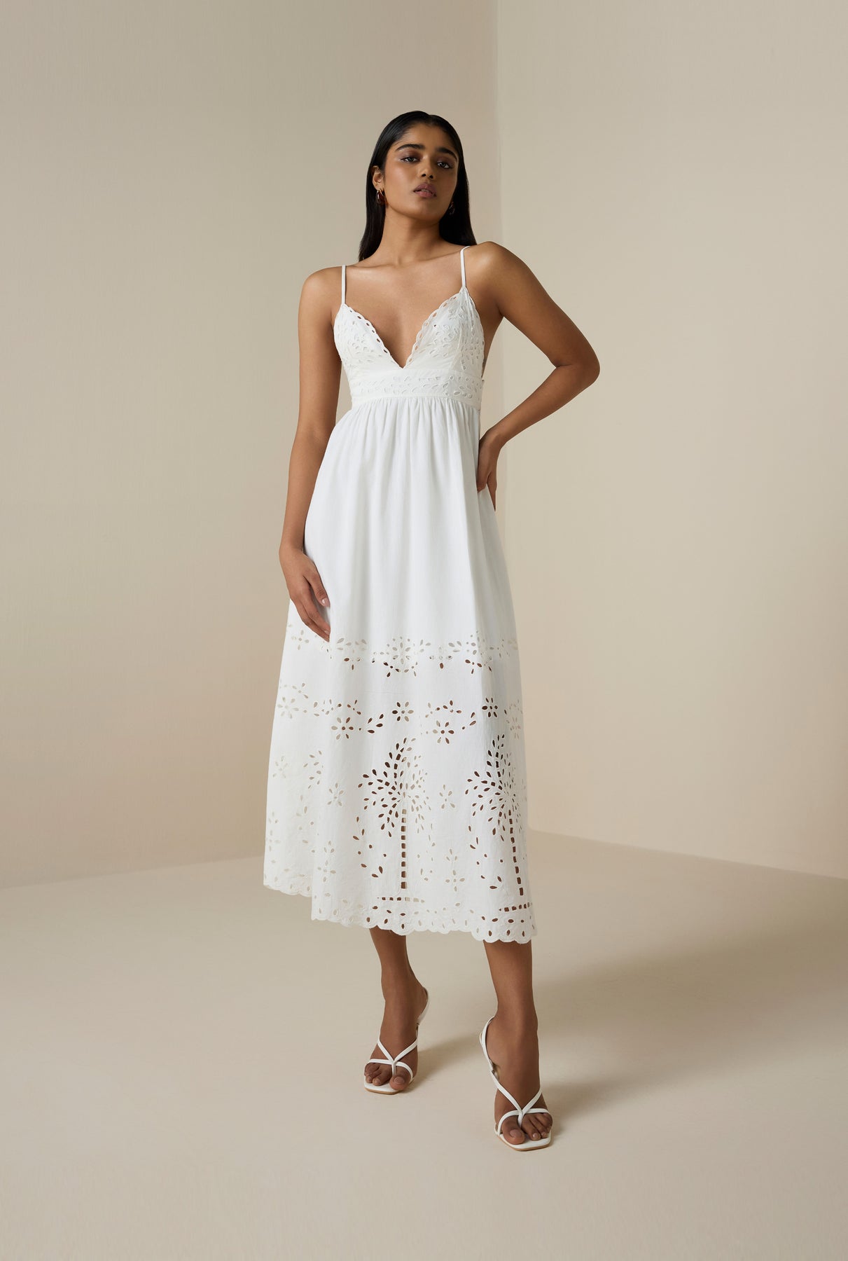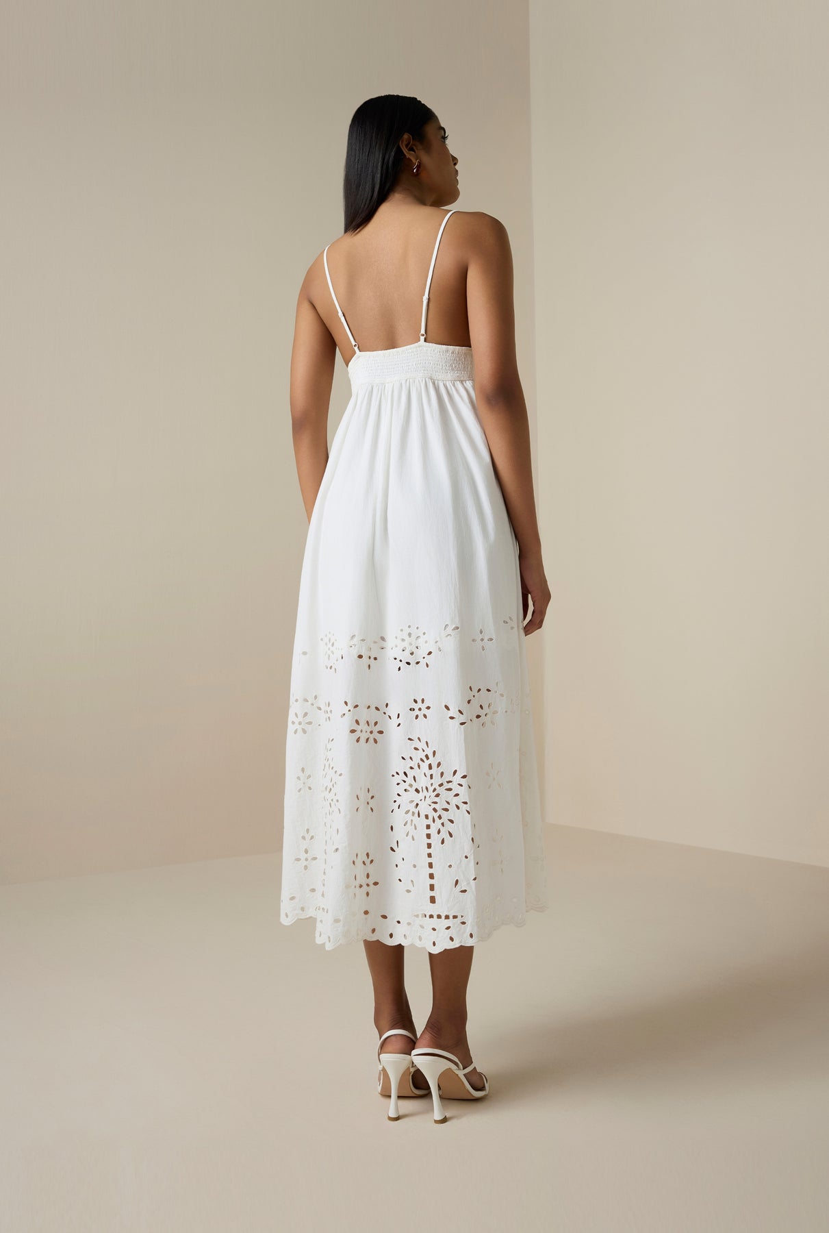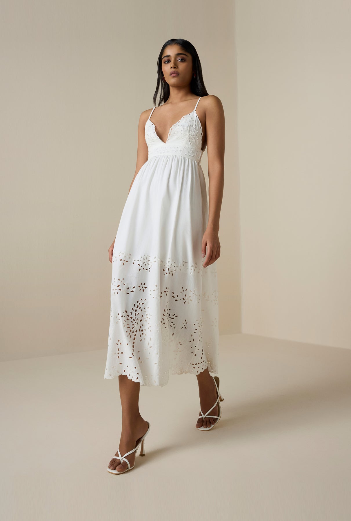 The Bagh Midi Dress from the Resort ’26 collection highlights effortless femininity through delicate craftsmanship. Made from pure ivory cotton, it features intricate Schiffli embroidery that adds soft texture and charm. The silhouette is fitted at the bust with a deep V-neckline and fine spaghetti straps, while a side zipper closure ensures a clean, comfortable fit. Light, refined, and timeless, this dress is perfect for warm days and relaxed moonlit evenings.