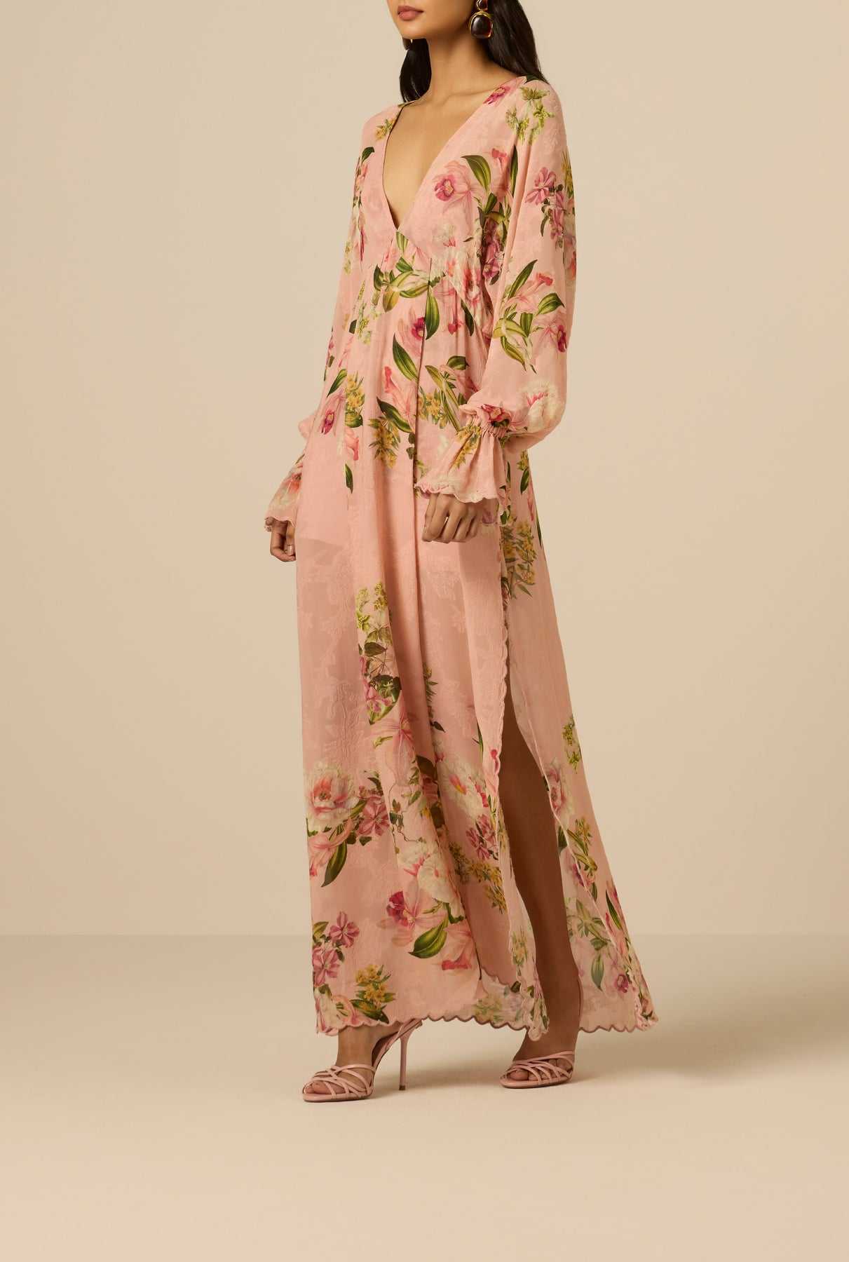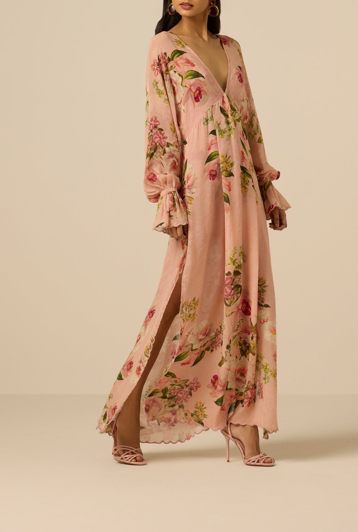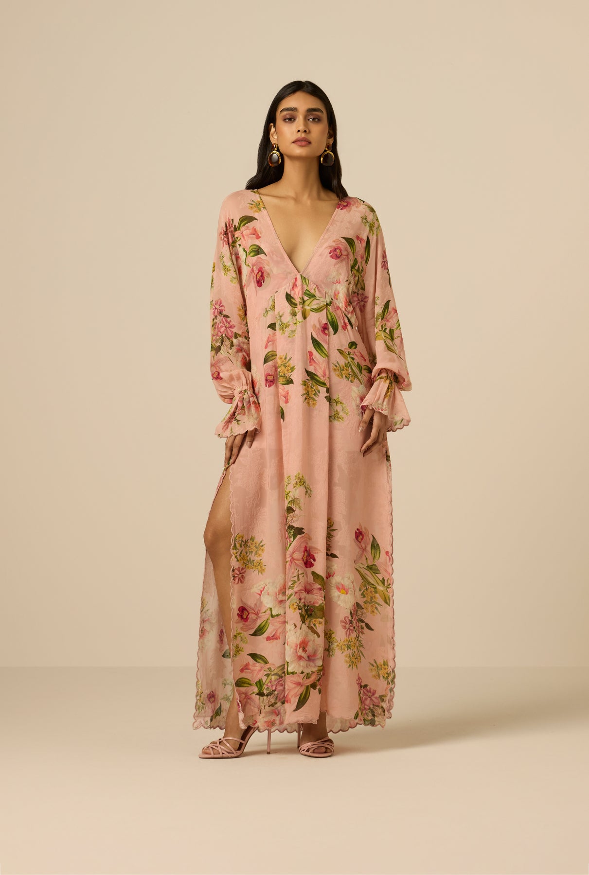 A season staple, the Ayla Maxi Kaftan from the Spring ’26 Collection captures the ease of holiday dressing. Crafted in peach viscose, georgette jacquard with a floral print, the relaxed silhouette flows effortlessly with movement. The V-neckline extends into delicate back bow ties, while kimono sleeves finished with ruffled cuffs add softness and dimension. Scallop embroidery along the ruffle edge, sides, and hem brings artisanal detail, and the coordinating printed slip ensures comfort and coverage.