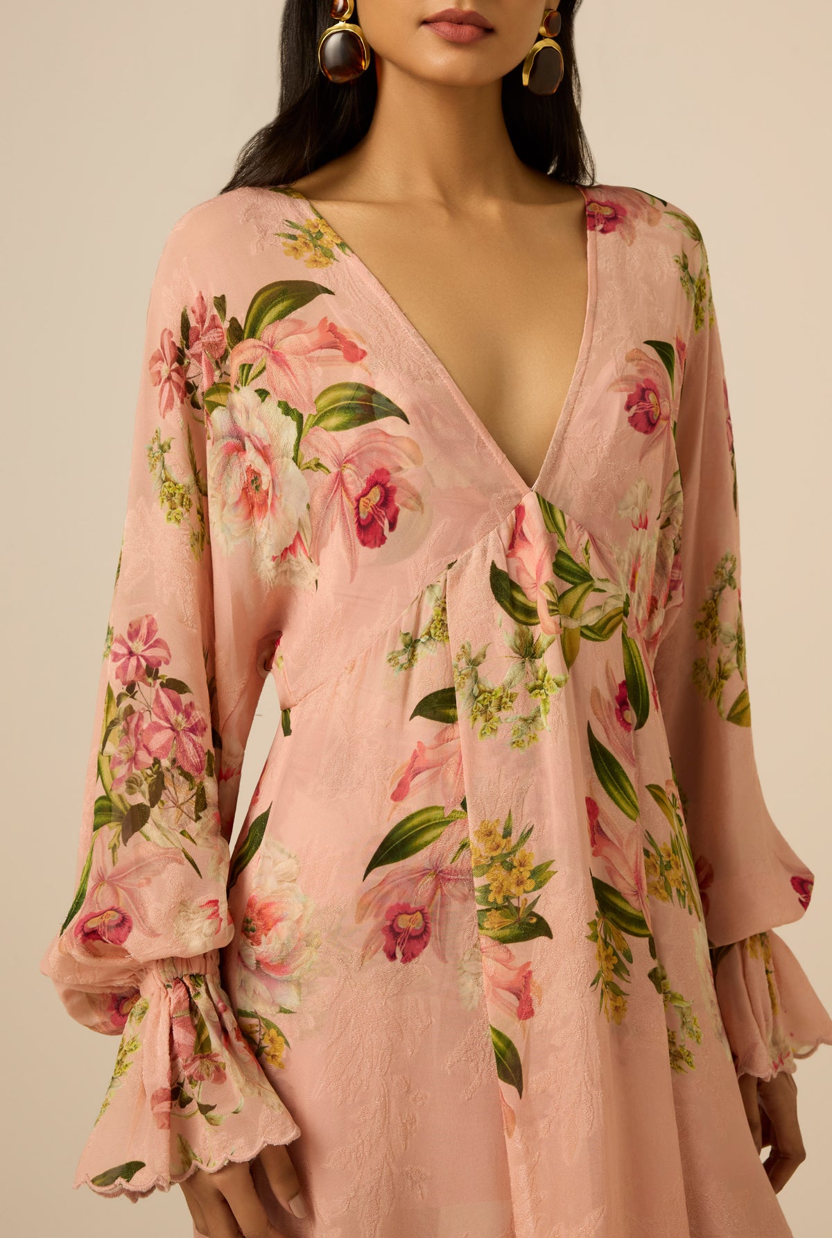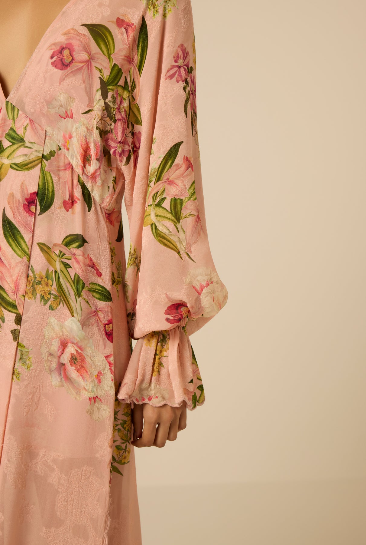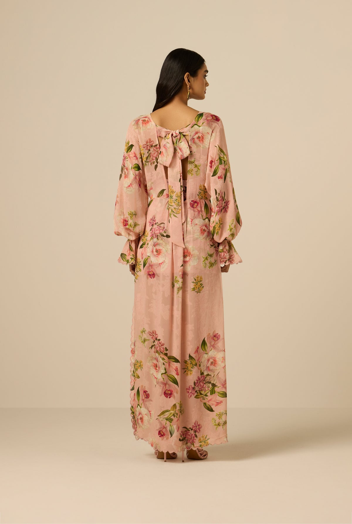 A season staple, the Ayla Maxi Kaftan from the Spring ’26 Collection captures the ease of holiday dressing. Crafted in peach viscose, georgette jacquard with a floral print, the relaxed silhouette flows effortlessly with movement. The V-neckline extends into delicate back bow ties, while kimono sleeves finished with ruffled cuffs add softness and dimension. Scallop embroidery along the ruffle edge, sides, and hem brings artisanal detail, and the coordinating printed slip ensures comfort and coverage.