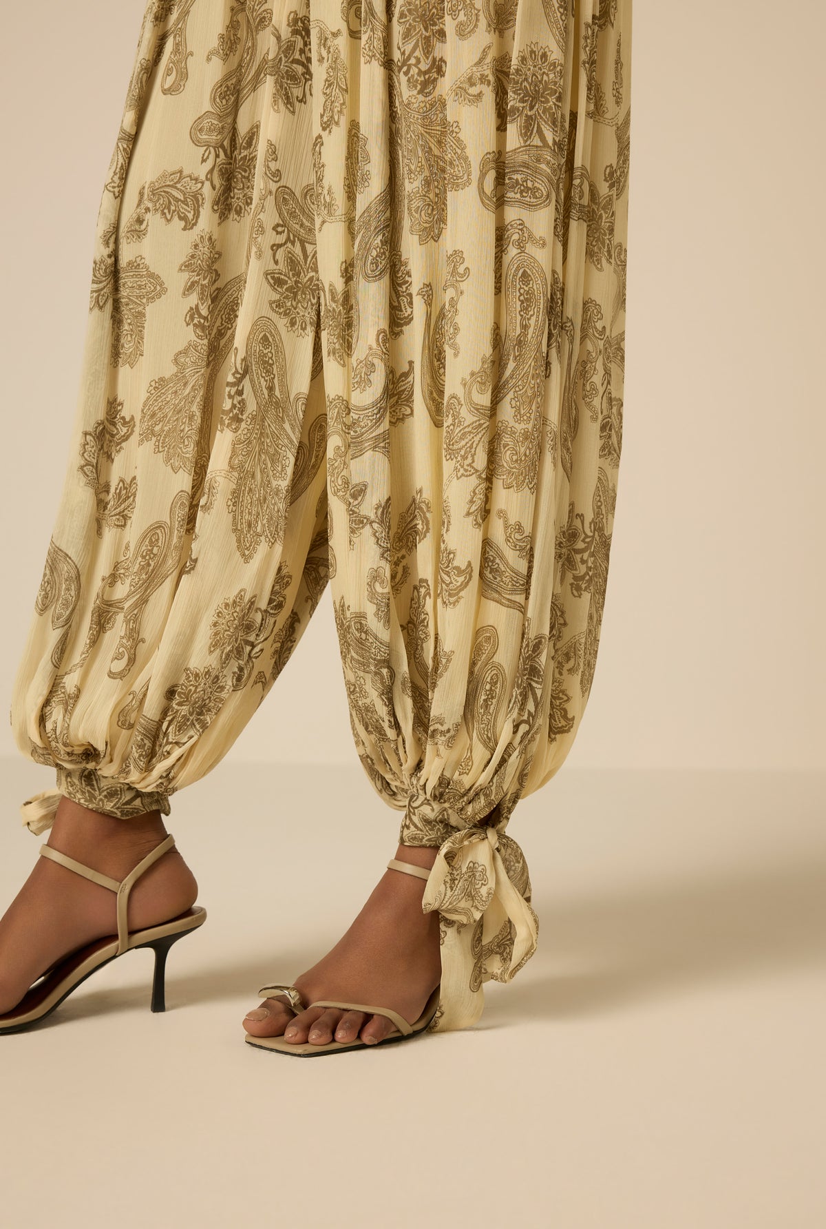 Boho-chic in spirit and light in movement, the Dani Harem Pants from the Spring ’26 Collection are crafted in ivory viscose crinkle chiffon with a chintz floral print. Designed in a relaxed mid-waist silhouette, the slip-on style offers ease, while full lining ensures comfort and coverage. The airy texture and soft drape enhance their effortless, free-spirited feel.