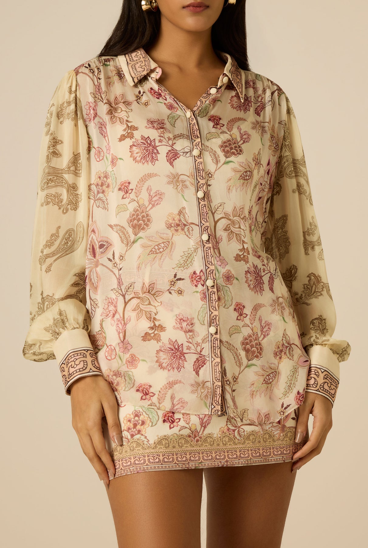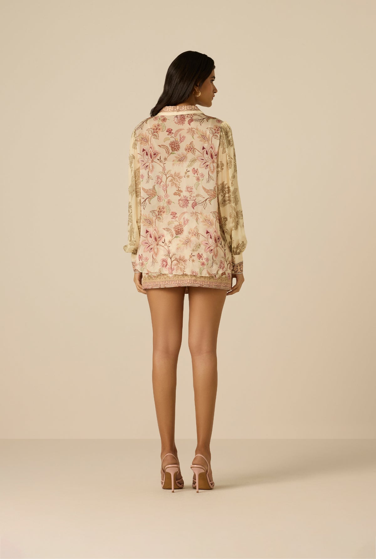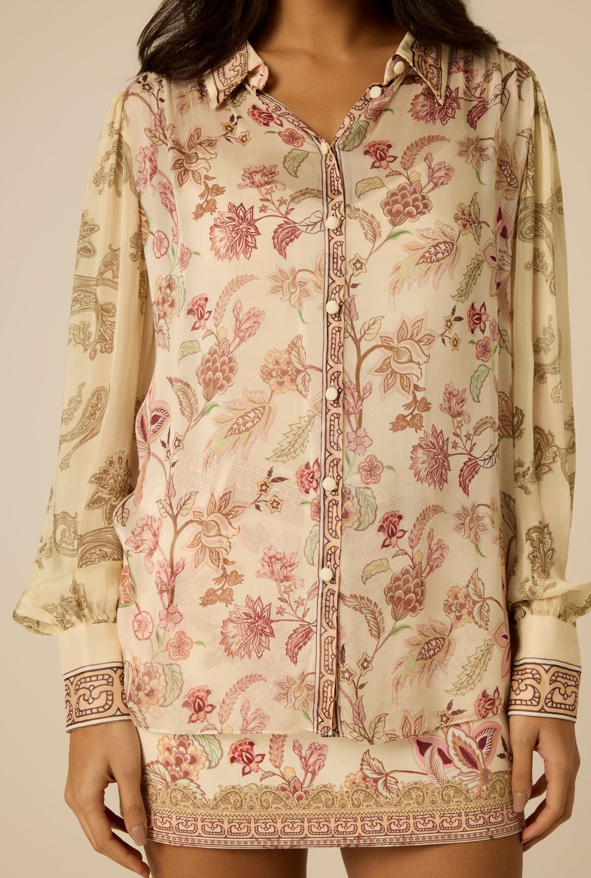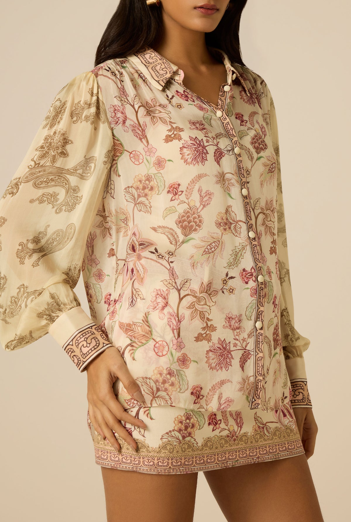 Delicate florals and fluid texture define the Dani Shirt from the Spring ’26 Collection. Crafted in ivory viscose flat chiffon with a floral chintz print, the loose silhouette features a classic shirt collar, front button placket, and softly cuffed sleeves. A coordinating cami is included for coverage. Pair it with the Dani shorts for a complete look!