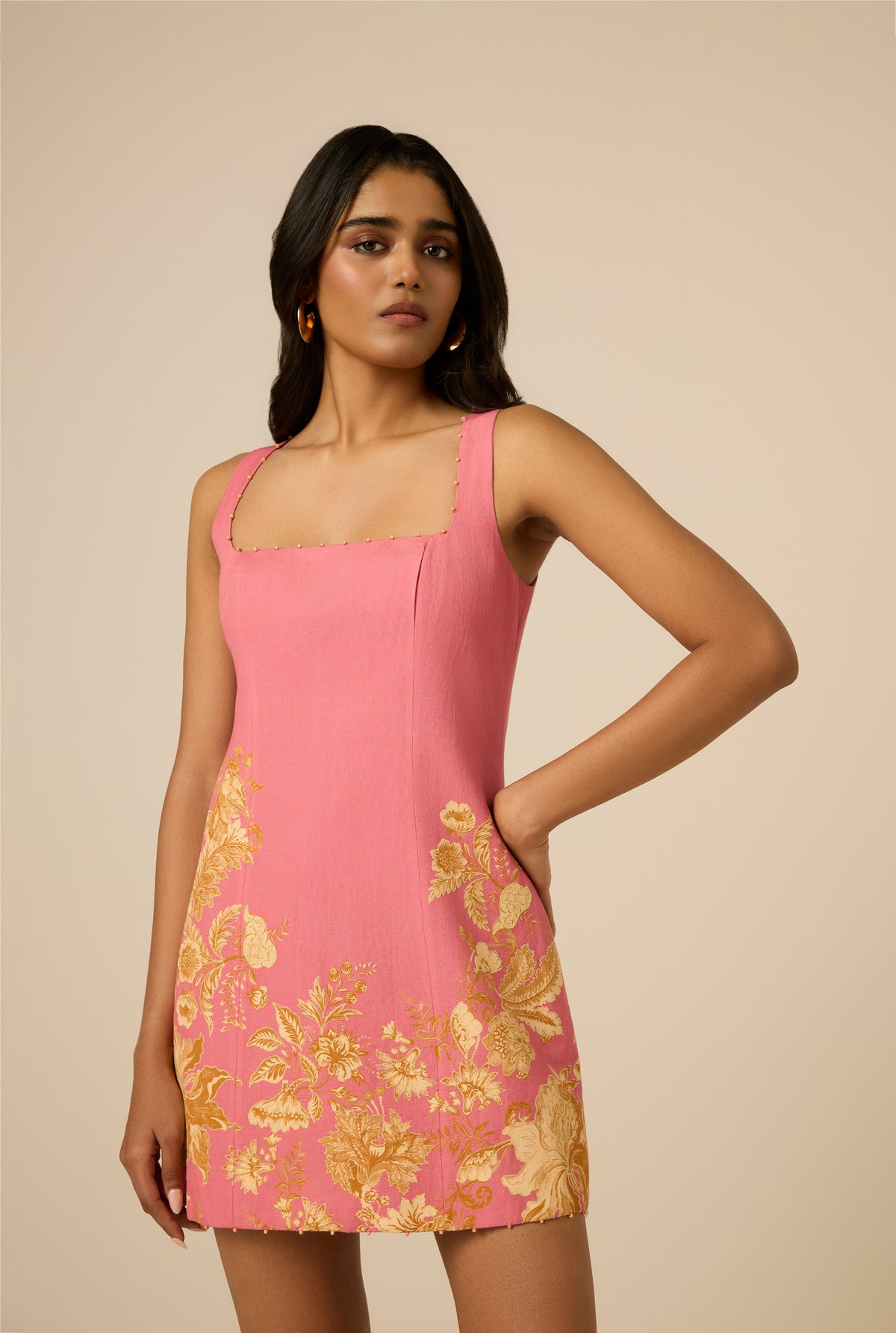 Blooming pink chintz florals set the tone for the Dani Mini Dress from the Spring ’26 Collection. Crafted in a breathable linen-cotton blend, the fitted design is framed by a clean square neckline and halter-style neck that highlights the shoulders. Fully lined, the dress comes with a concealed back zipper for a seamless finish.