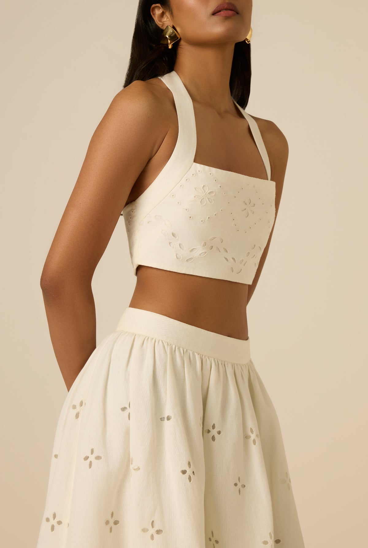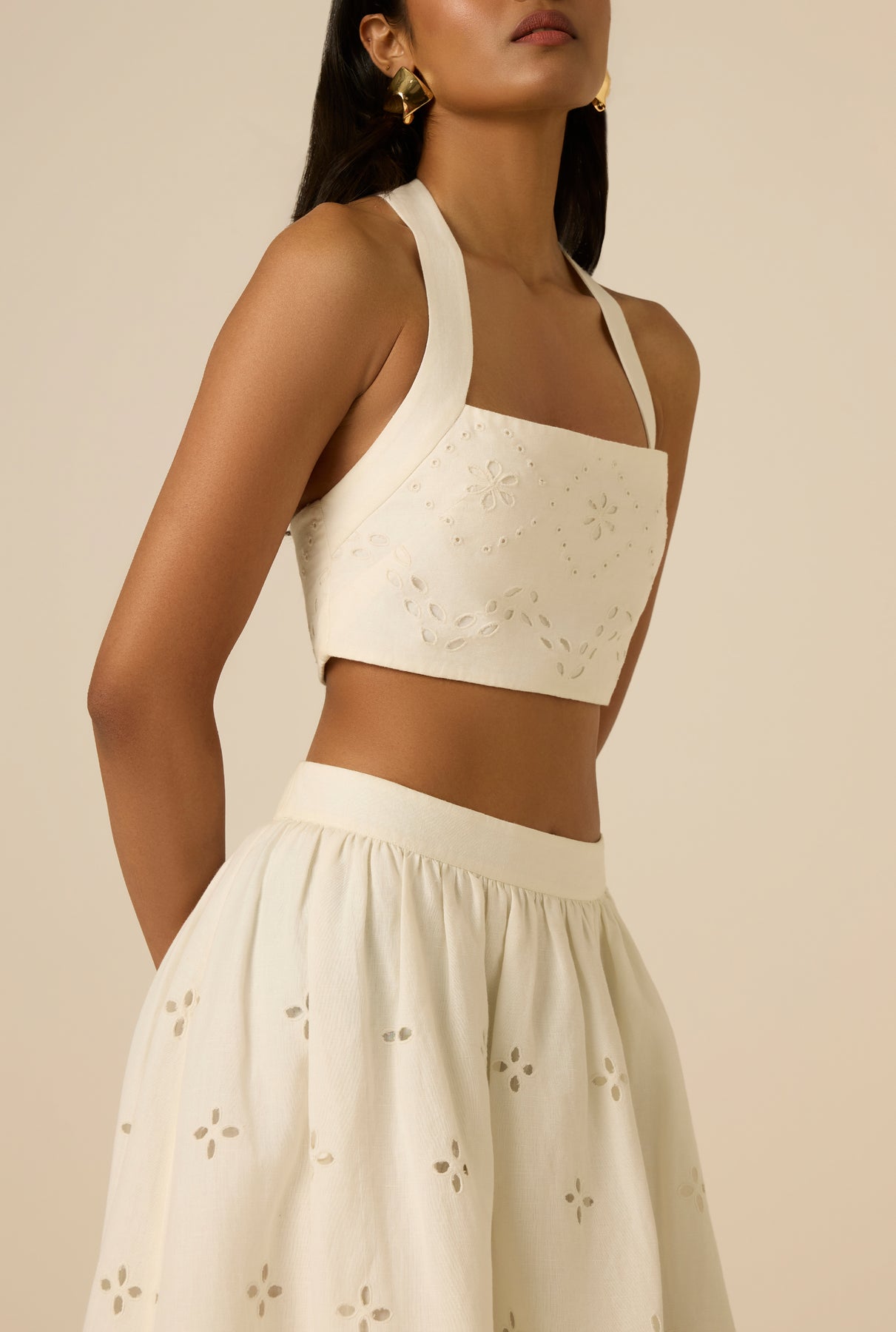 Reminiscent of sunlit days, the Kota Crop Top is from the Spring ’26 Collection. Crafted in white linen-cotton and detailed with schiffli and geometric embroidery, the fitted silhouette is framed by a halter neckline with thick straps. A concealed side zipper and full lining ensure comfort and a smooth finish. Pair it with the Kota shorts or Kota Midi Skirt for a sunkissed pristine look!