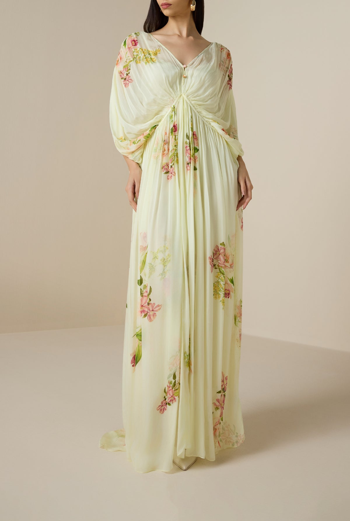 The Aiva Kaftan from Spring '25 brings together relaxed charm and refined style. Made from soft viscose flat chiffon, this ivory floral kaftan features a loose fit, V-neck, and kimono sleeves with adjustable drawstrings. Tassels add a playful touch, while the slip-on design ensures comfort and ease. Perfect for lounging or casual outings, this kaftan captures the serene essence of spring!