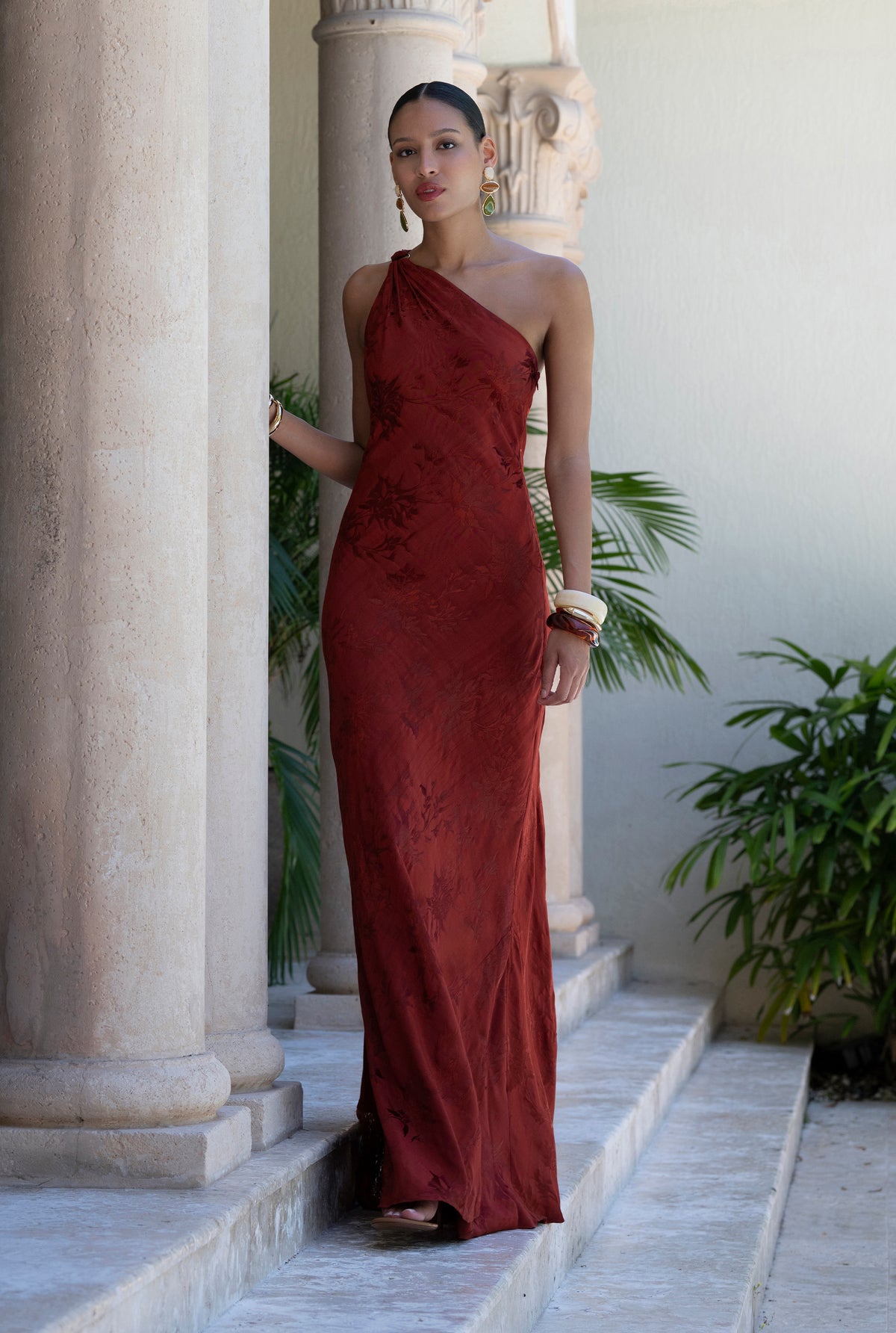 A striking balance of elegance and ease, the One Shoulder Aura Maxi Dress is from the Resort 2026 Collection. Crafted in a fluid viscose flower jacquard, this terracotta hued maxi dress makes a statement with its asymmetric one-shoulder neckline and a sweeping sash that falls gracefully, finished with playful fringed ends. The fitted silhouette and full viscose lining lend both structure and comfort, while the side zipper closure offers convenience. A standout piece for sunset soirées and destination evenings.