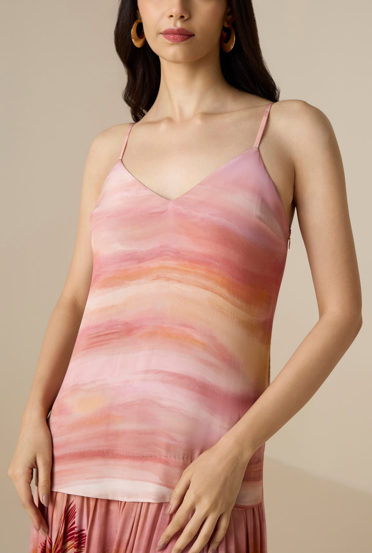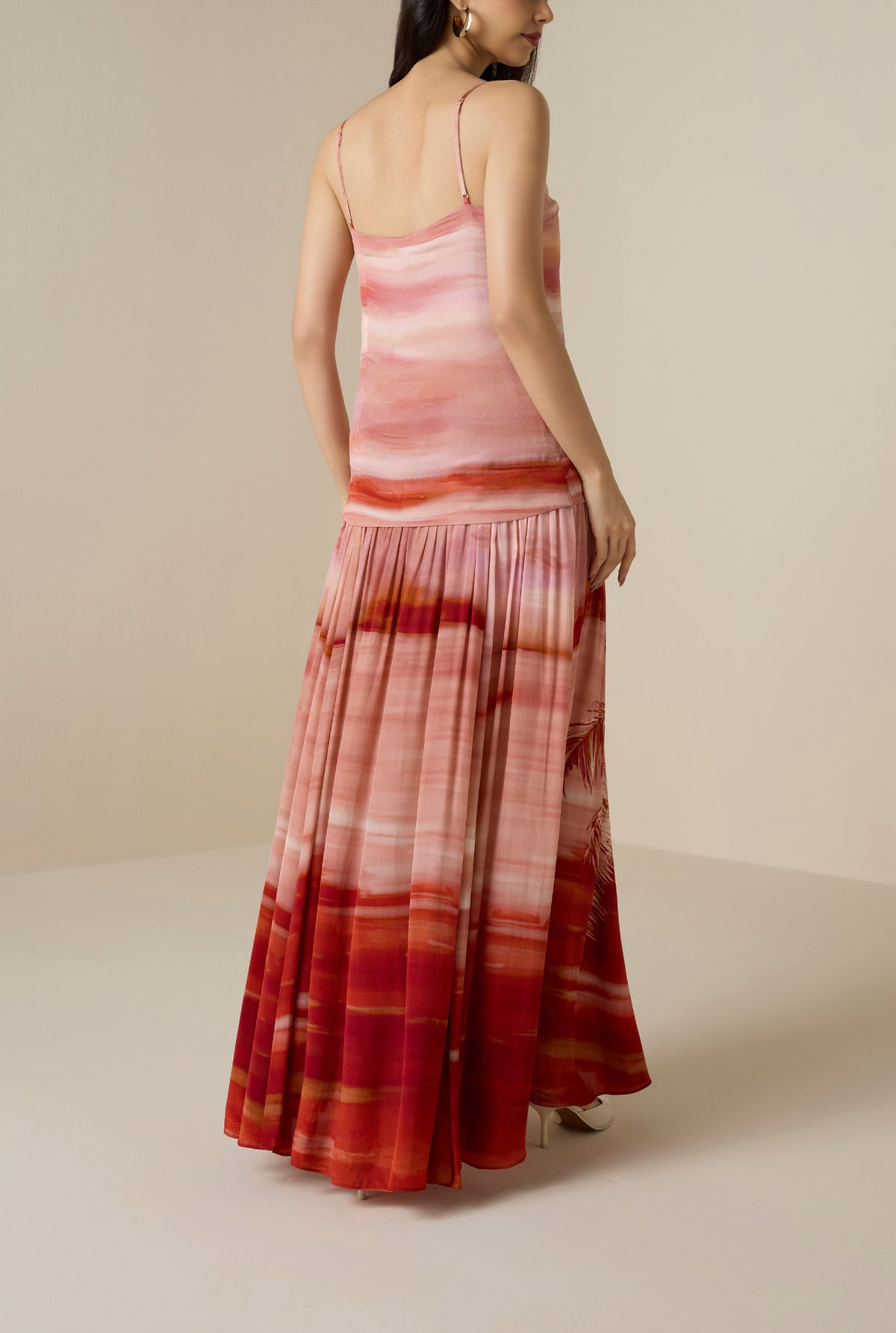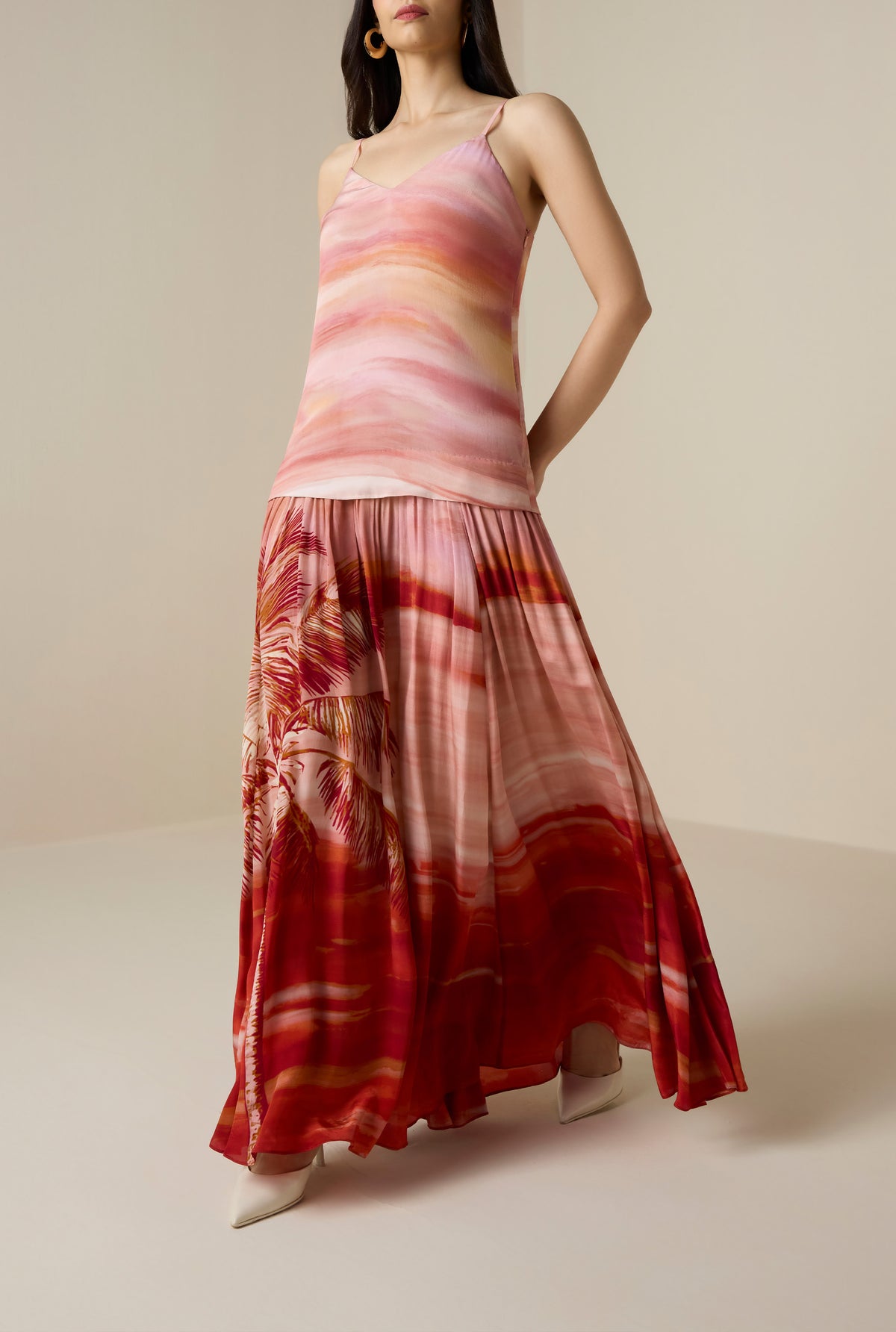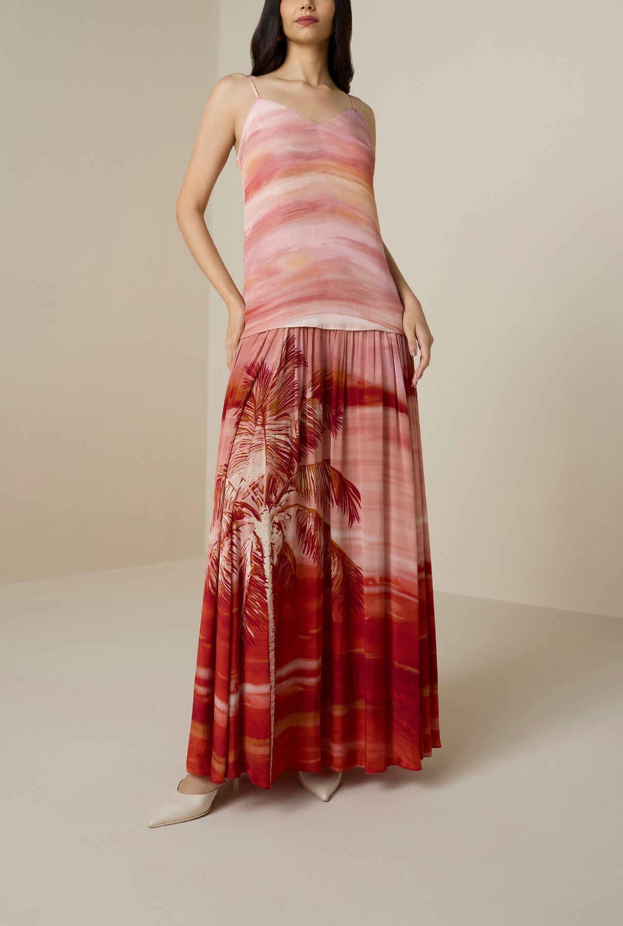 The Asma Maxi Dress from the Resort ’26 collection embodies breezy sophistication. Crafted in coral viscose natural crepe, it features a ombre hued relaxed silhouette, enhanced by a vacay-inspired tropical beach palm print.The V-neckline with slender spaghetti straps adds a touch of ease, while the bodice lining and side zipper closure ensure comfort and a smooth fit. Chic and uplifting, it’s a go-to style for beach days and serene resort evenings.