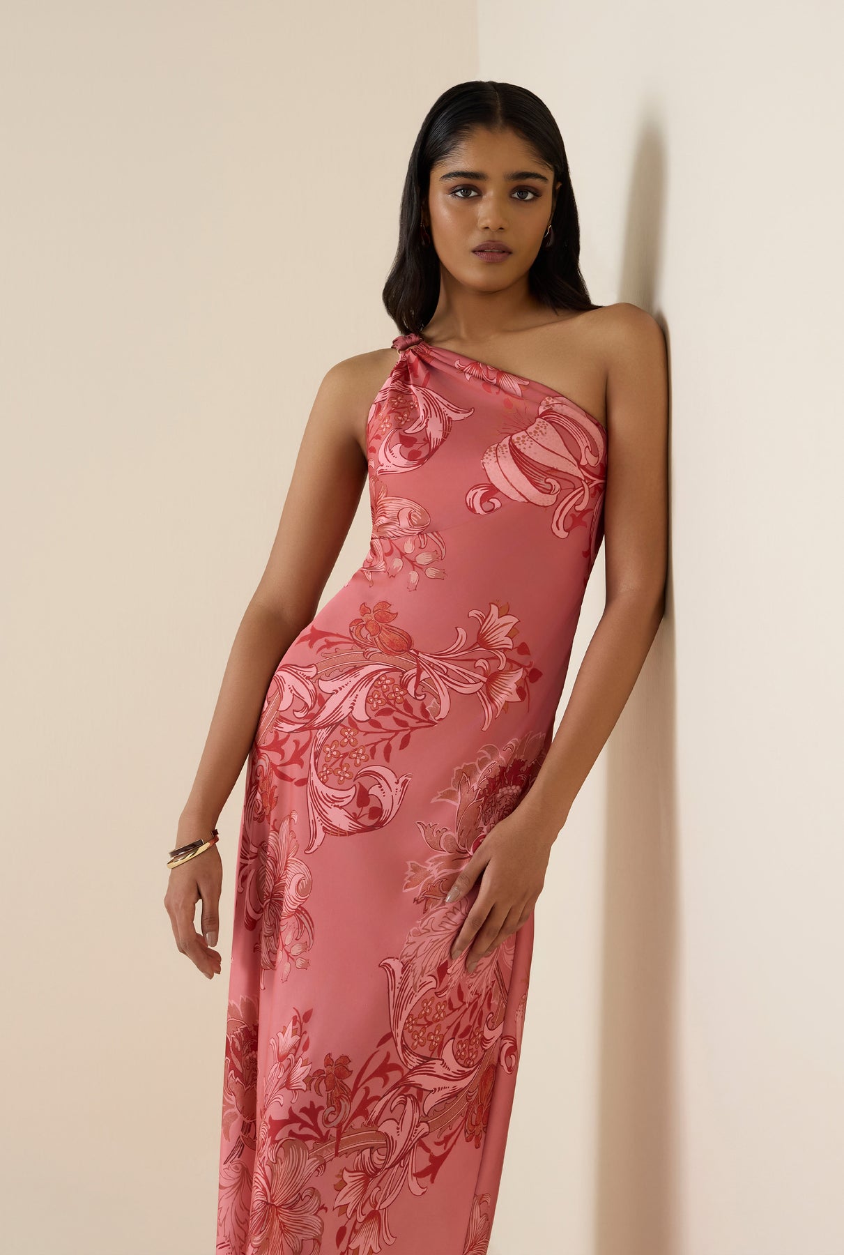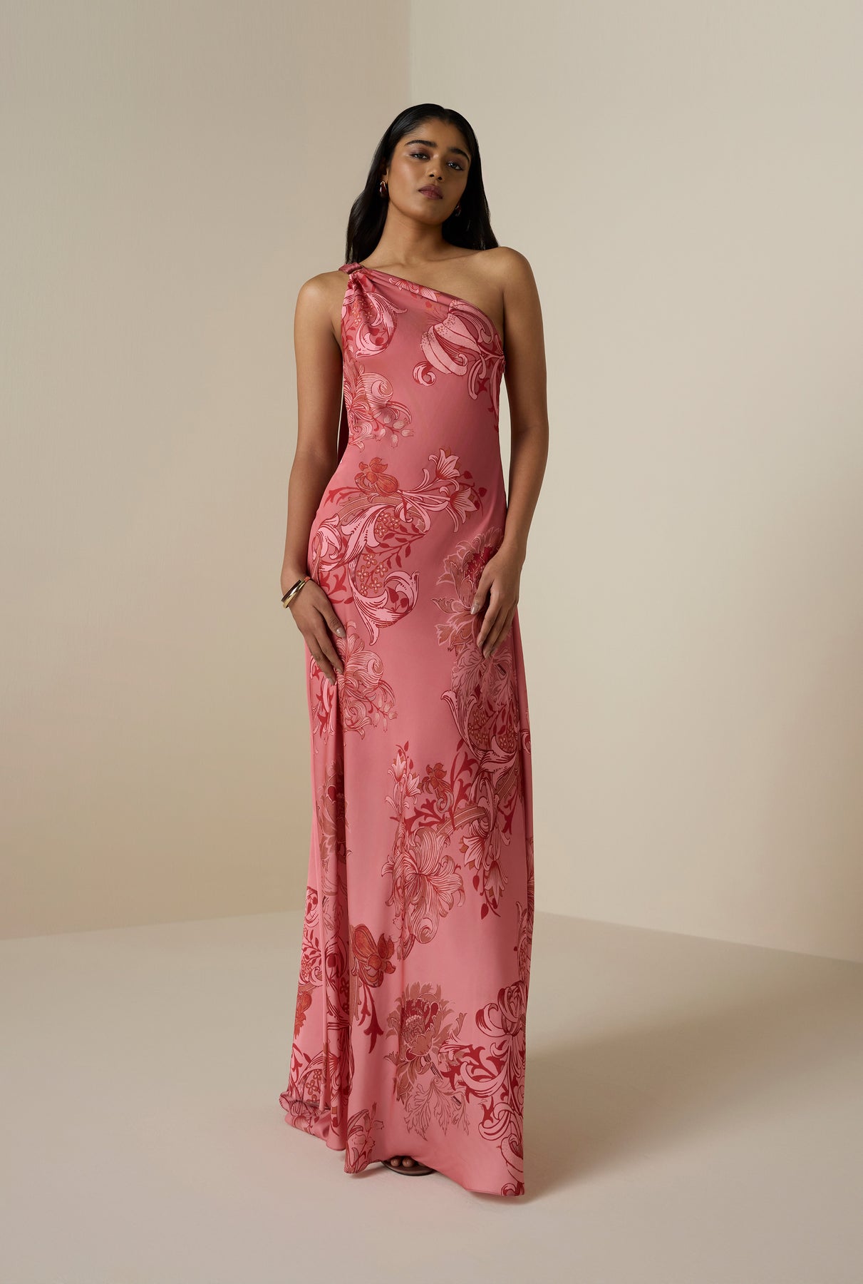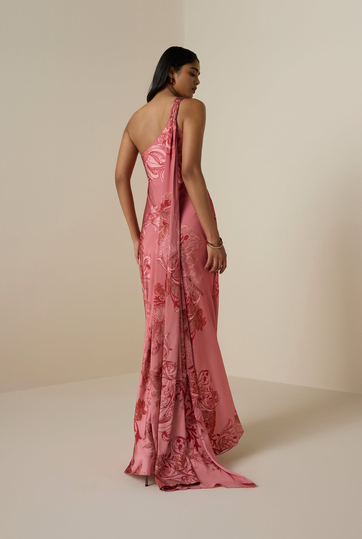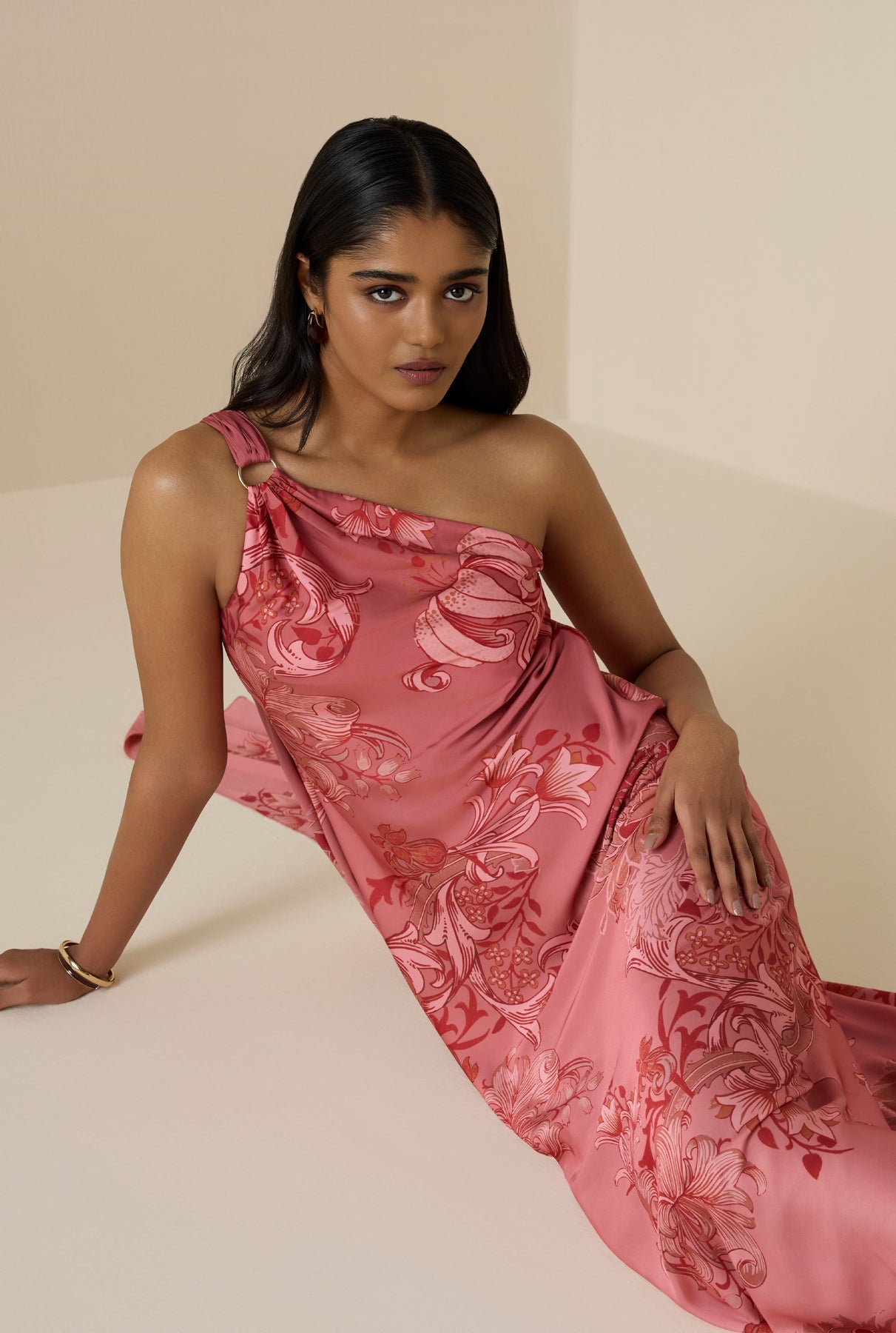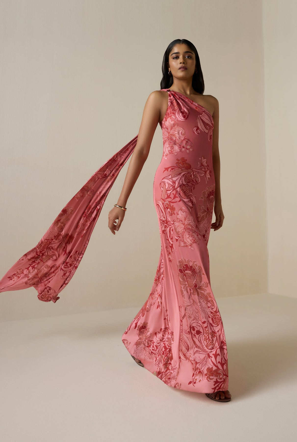 The Vine One-Shoulder Dress from the Resort ’26 collection brings modern femininity to a vibrant, contemporary silhouette. Crafted in coral poly satin lycra and adorned with a pleasing floral print, it features a fitted bodice with a sleek one-shoulder neckline for understated drama. The side zipper ensures a smooth finish, while the fluid sash detail adds soft movement and grace.