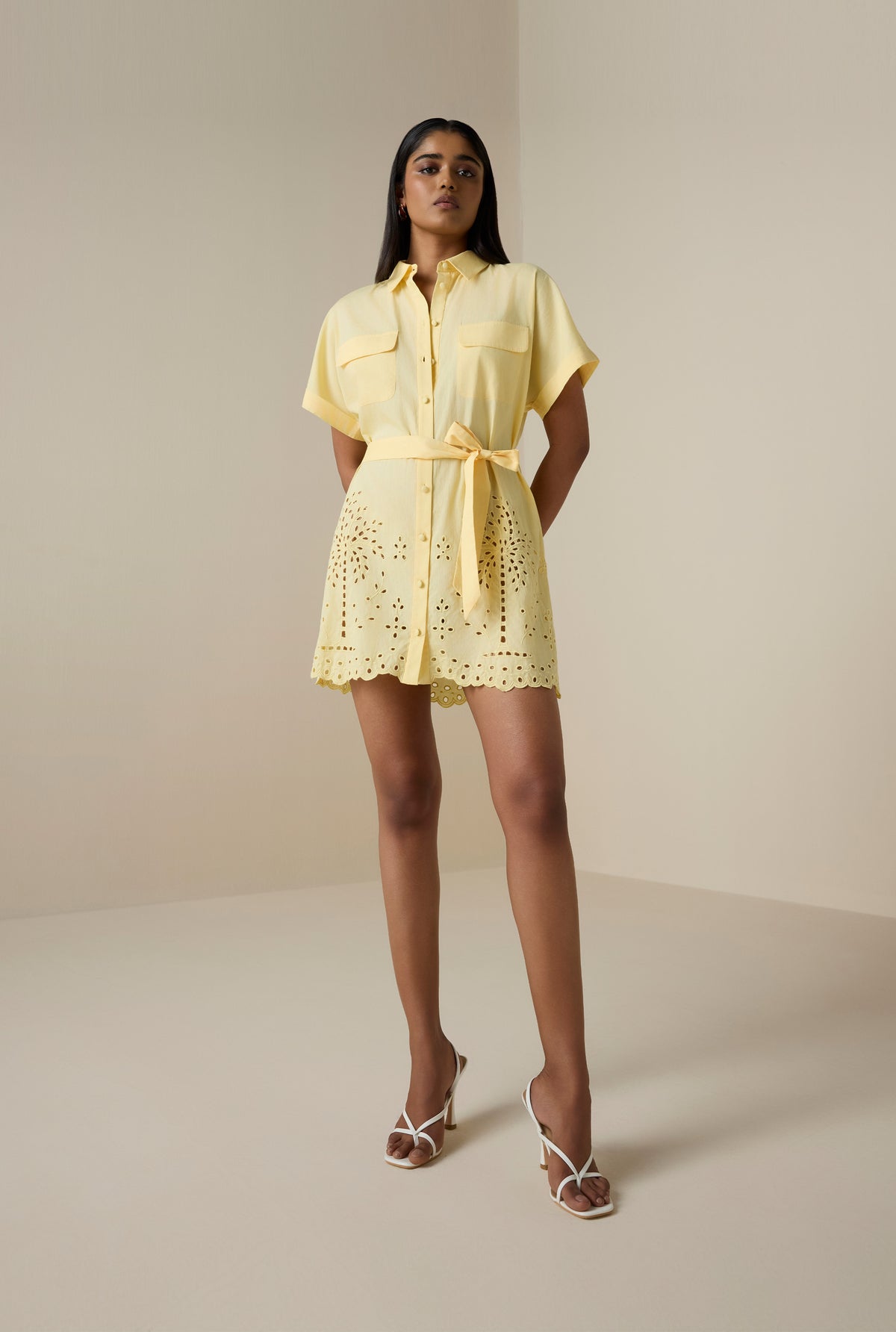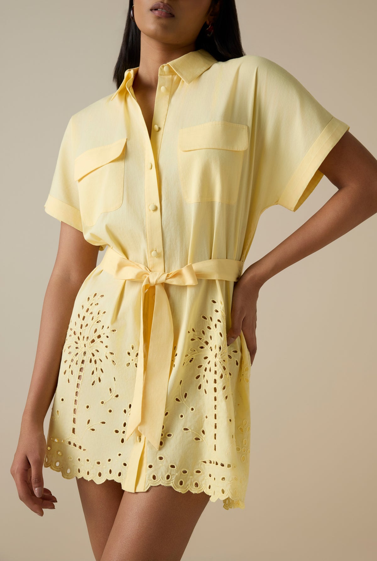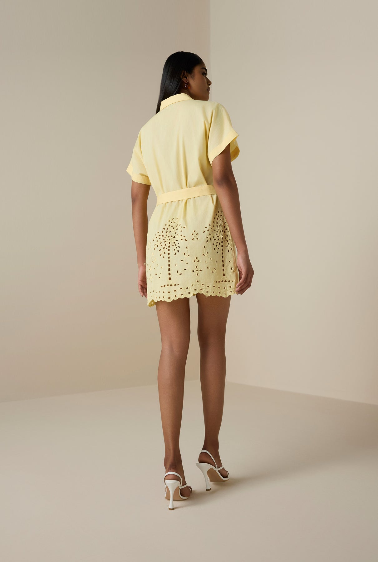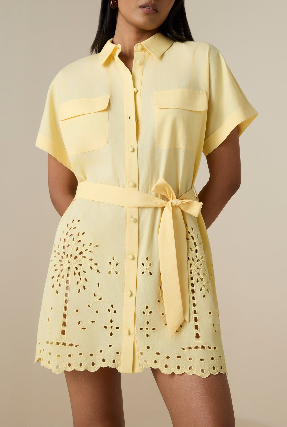 The Bagh Drop-Shoulder Mini Dress from the Resort ’26 collection brings a breezy charm to everyday resort dressing. Crafted in powder yellow cotton with delicate schiffli embroidery featuring vacay inspired palm motifs, it boasts of a relaxed laid back silhouette. The dress features a shirt collar, front button-down placket, and soft drop shoulders. The tie-up belt allows for adjustable shaping, while the included slip ensures comfort and coverage. Light, playful, and easy chic, its an ideal pick for warm, sunny days by the beach and beyond.