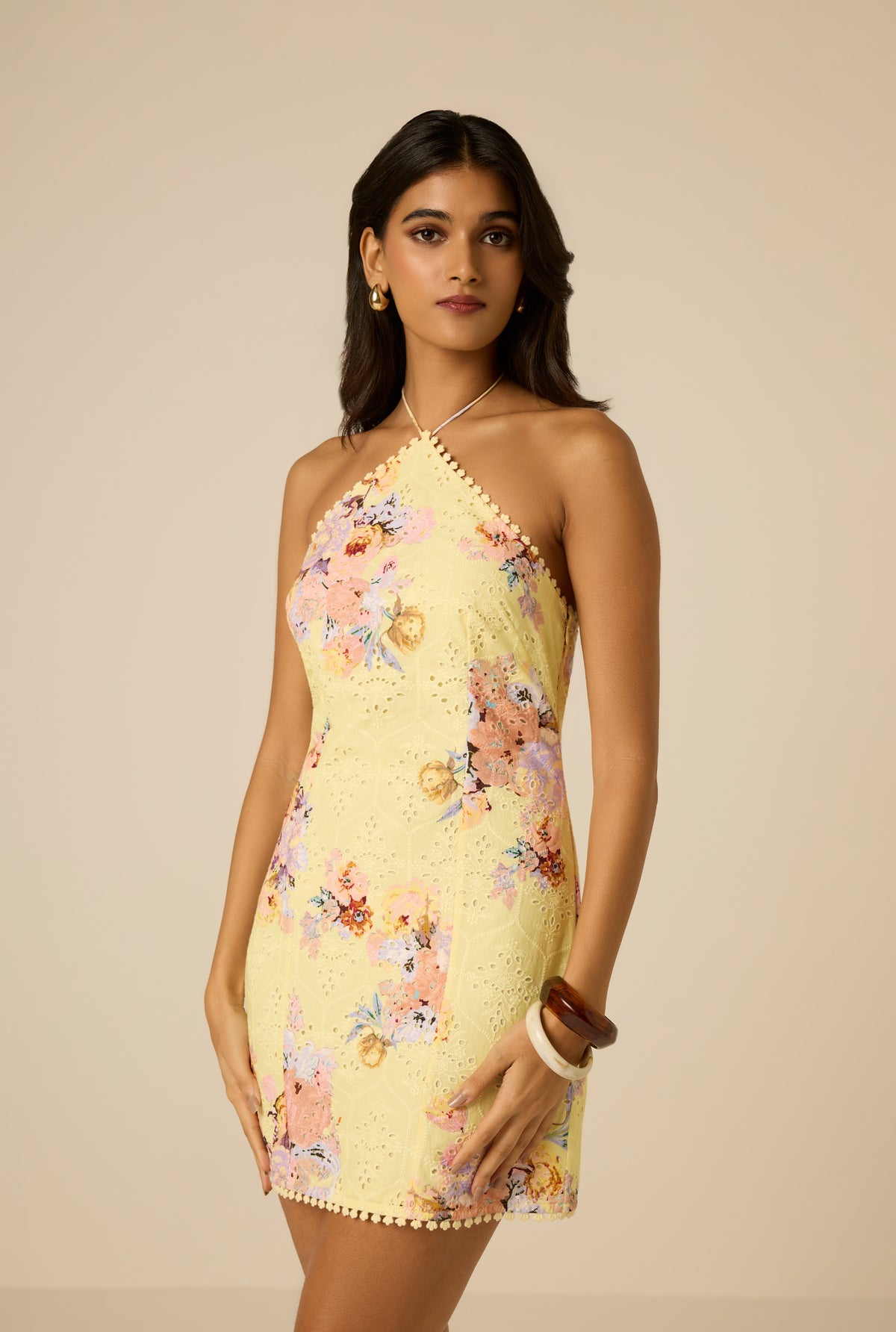 Sunlit florals and delicate texture define the Kysha Short Dress from the Spring ’26 Collection. Crafted in cotton schiffli with a yellow floral design, the fitted silhouette features a halter neckline with adjustable ties, finished with lace trim and tassel detailing. Fully lined, the dress comes with a side zipper closure.