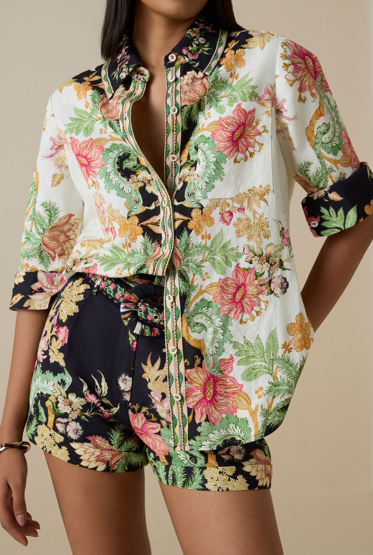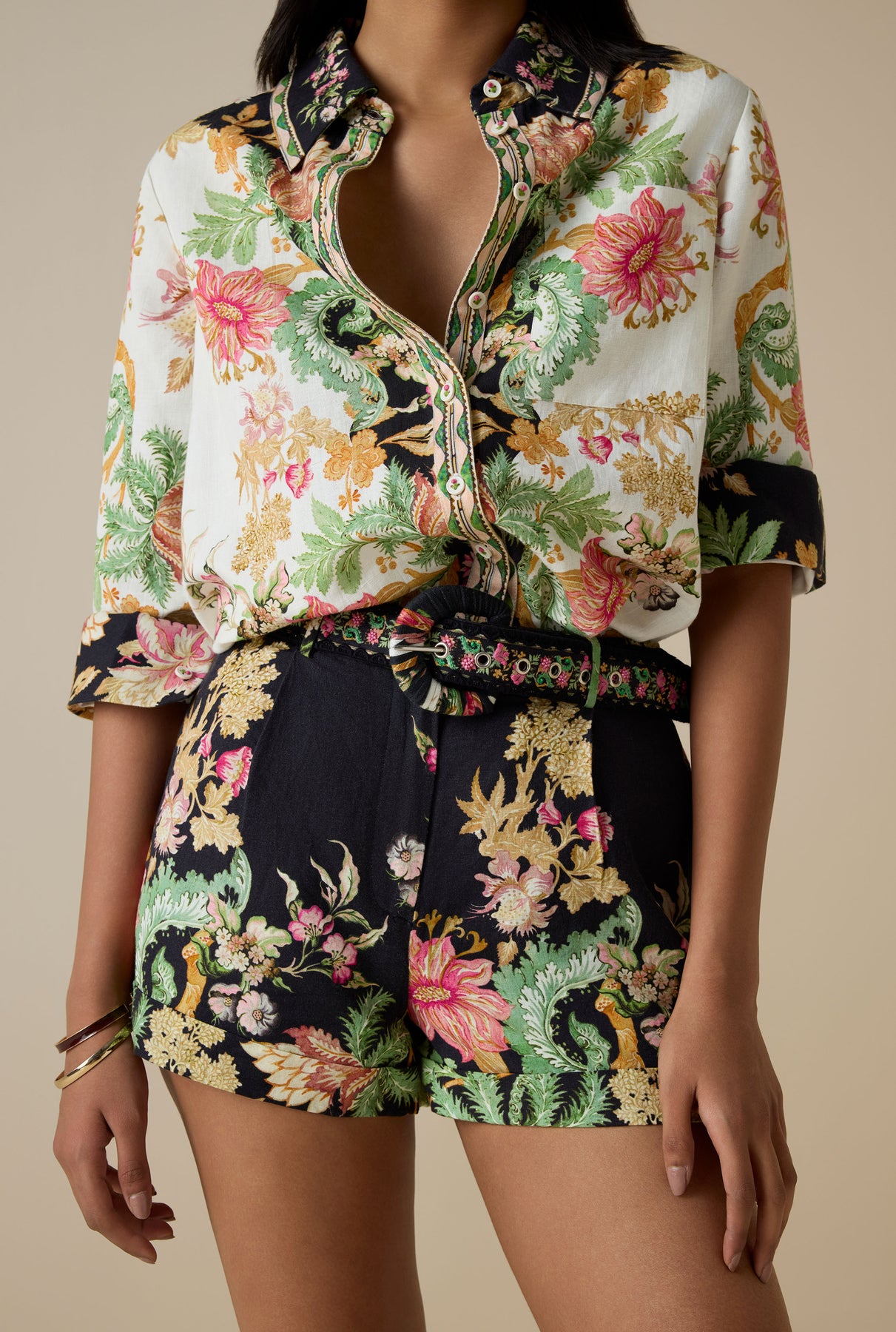 A summer staple reimagined, the Pahi Shorts are from the Summer'24 Collection. Crafted from breathable cotton linen, these black shorts feature delicate embroidery and a vibrant floral print.