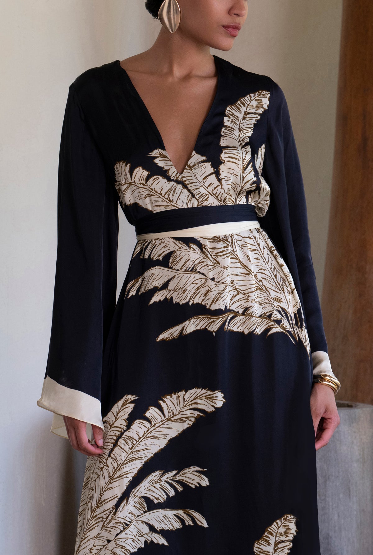 The Palm Belted Kaftan from the Ramadan ’26 collection is designed with grace and effortless charm. Crafted in fluid black viscose satin, it features a flowing silhouette with a V-neckline, slip-on ease, and full flared sleeves that lend a sense of poise. The signature palm print adds subtle artistry, while the tie-up belt allows for versatile styling. A timeless piece that balances modest elegance with contemporary appeal, it's perfect for Ramadan gatherings.